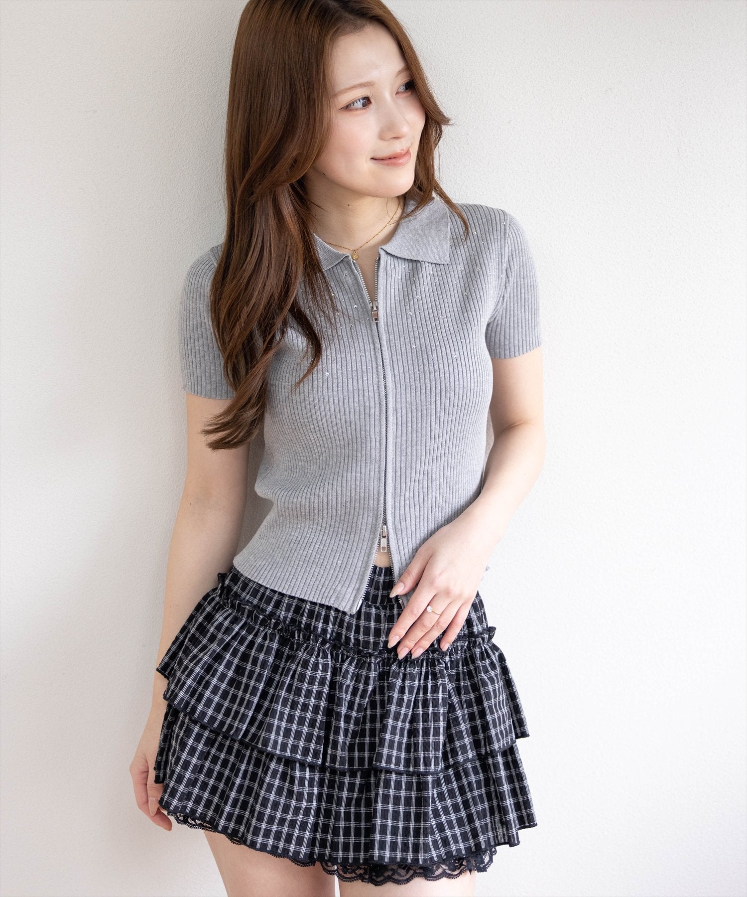 clear≪新作≫ダブルジップ半袖ラインストーンニットトップス[CL9714]