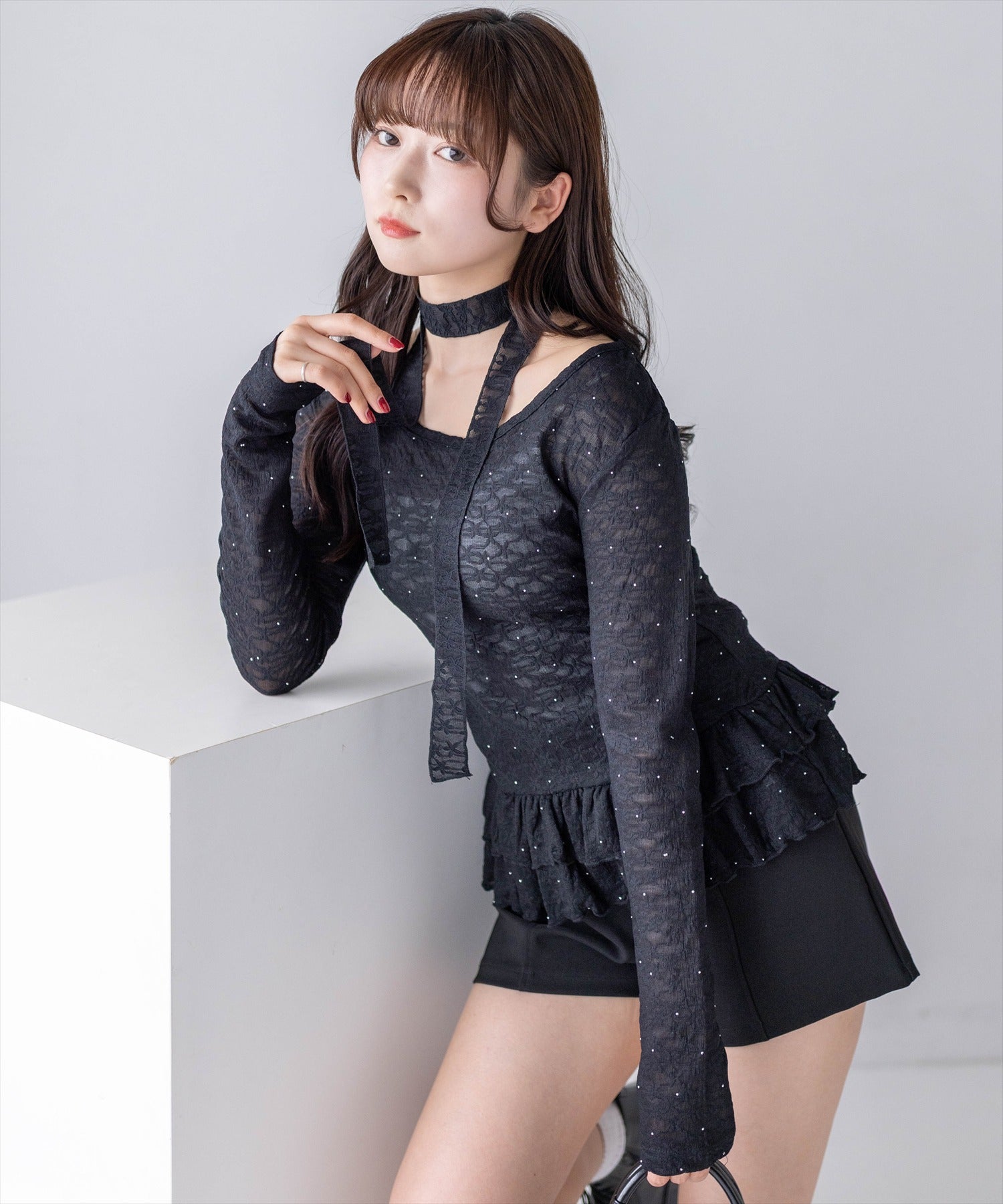 clear≪WEB先行販売/新作≫チョーカー付きラインストーンレースペプラムトップス[CL9865]