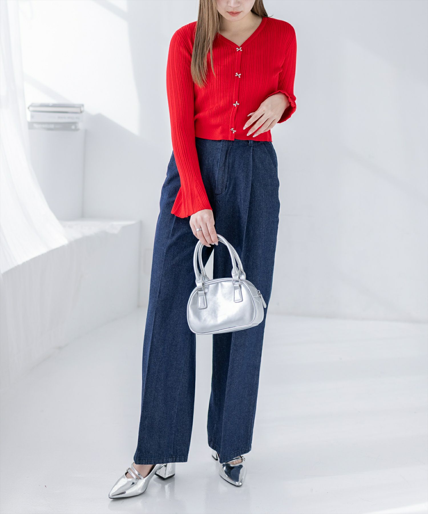 clear リボン付き袖口ファーニットカーディガン[CL9479]