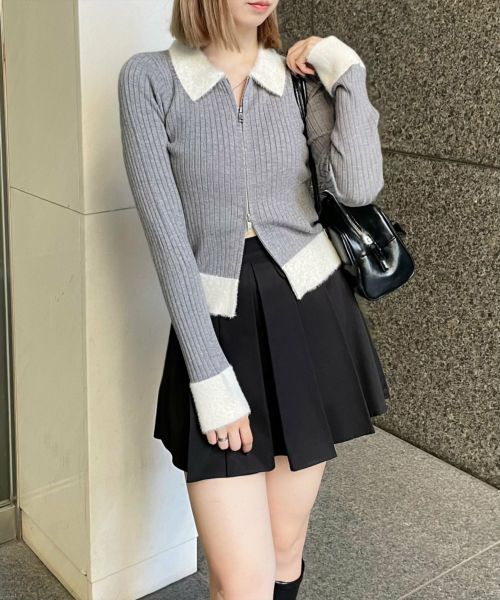 clear 襟袖ショートフェザーダブルジップリブニットトップス[CL8447]