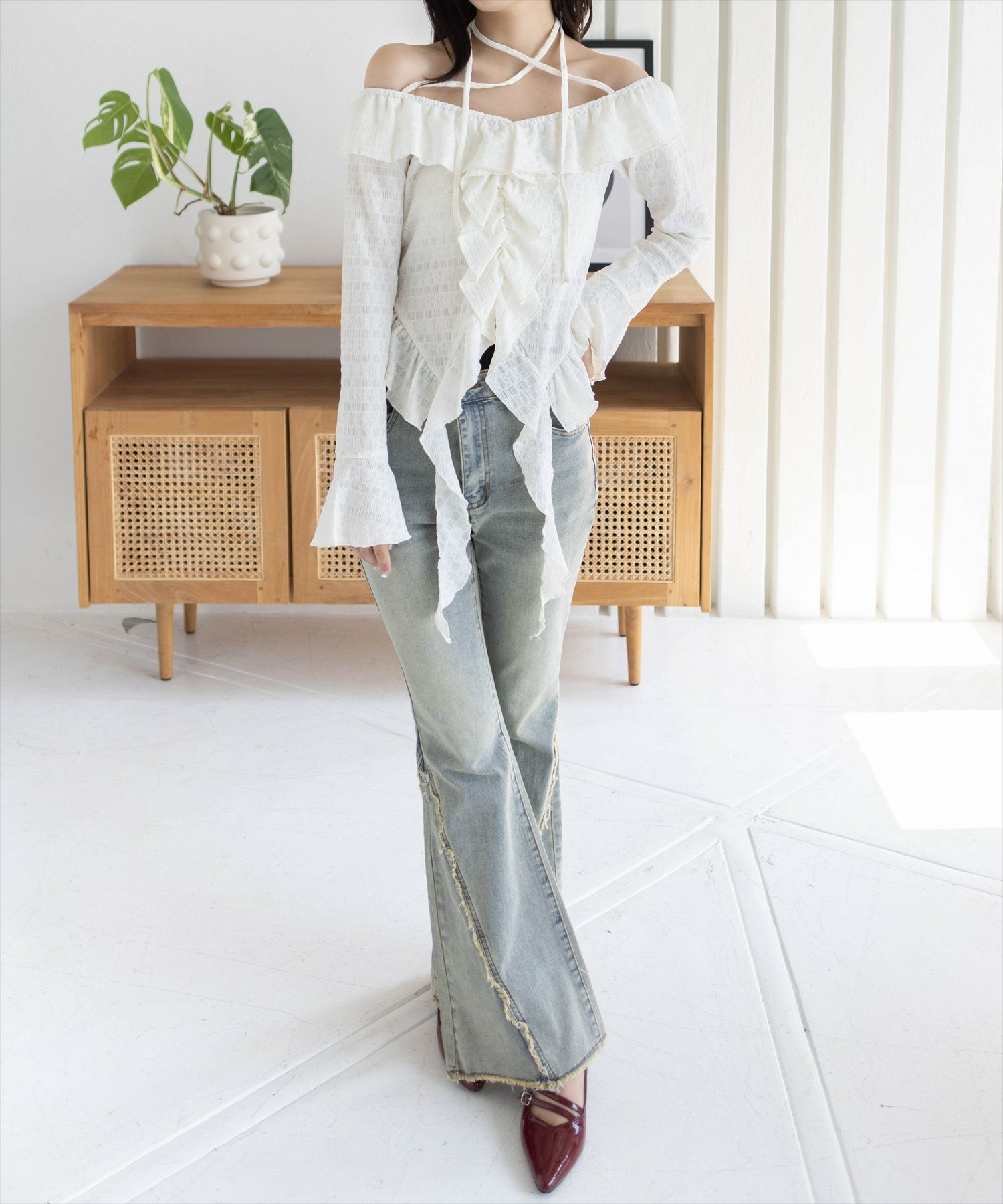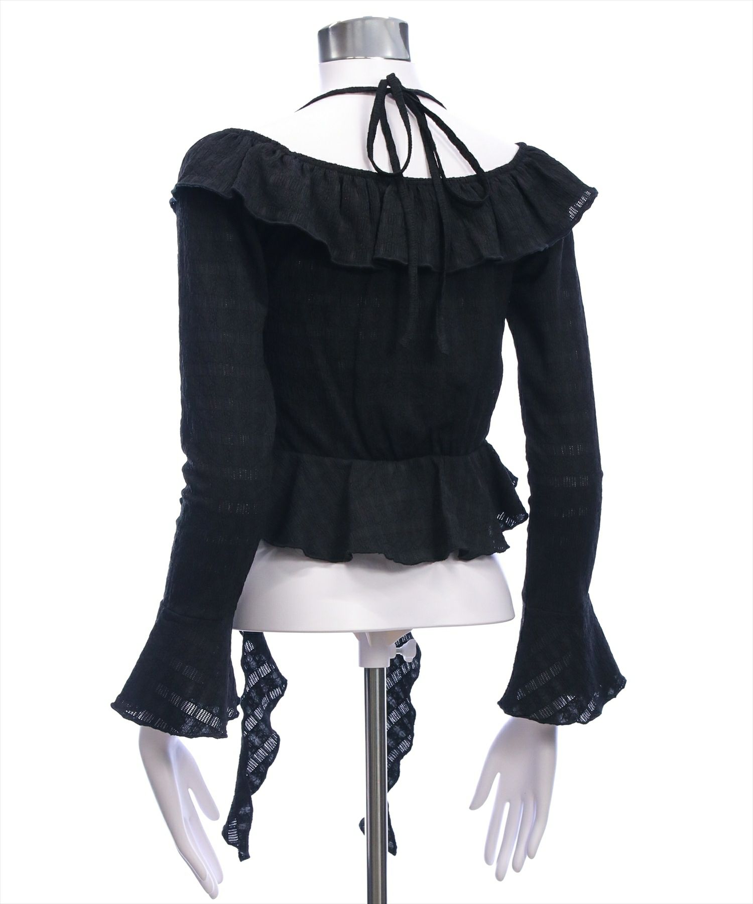 デコルテ美人見え!ネックストラップフリルブラウス