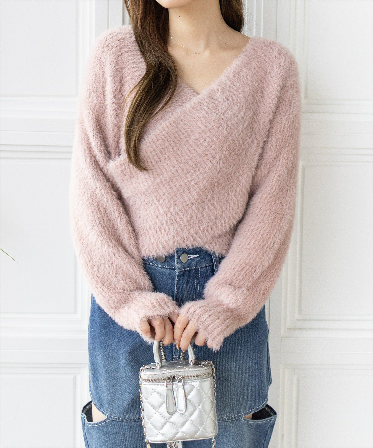 クロスデザインが上品な抜け感を演出するフェザーニットトップスです。繊細な毛足がシーズンらしい表情を添えつつ、女性らしい立体感のあるシルエットに。シンプルながらもモード感を漂わせる、大人っぽい印象に仕上がっています。