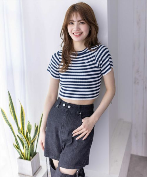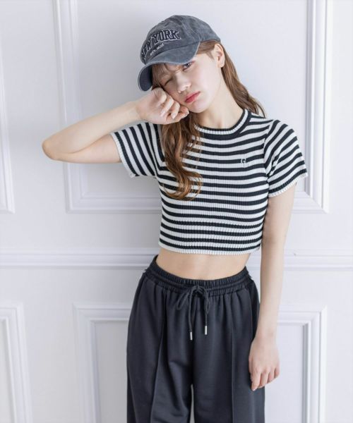 clear ワンポイント刺繍半袖ショート丈ニットトップス[CL8106]