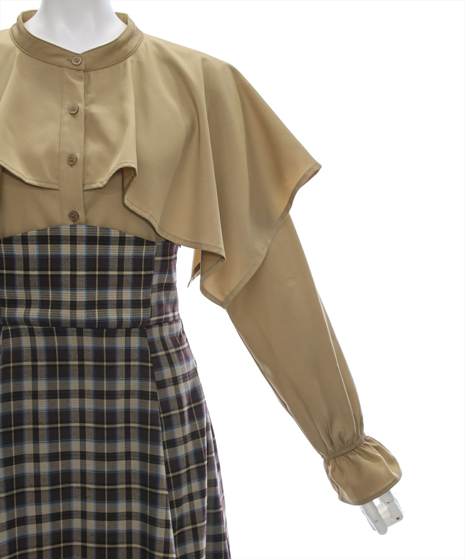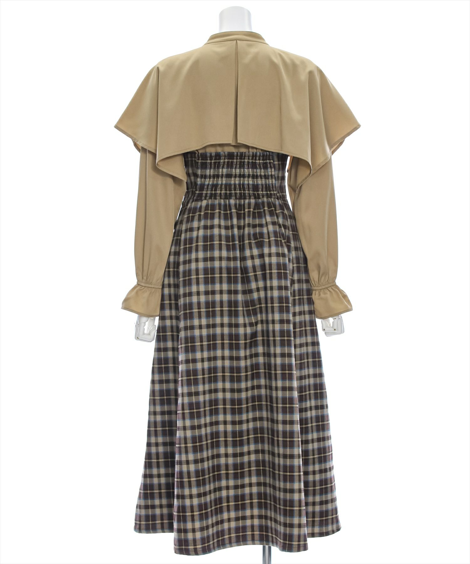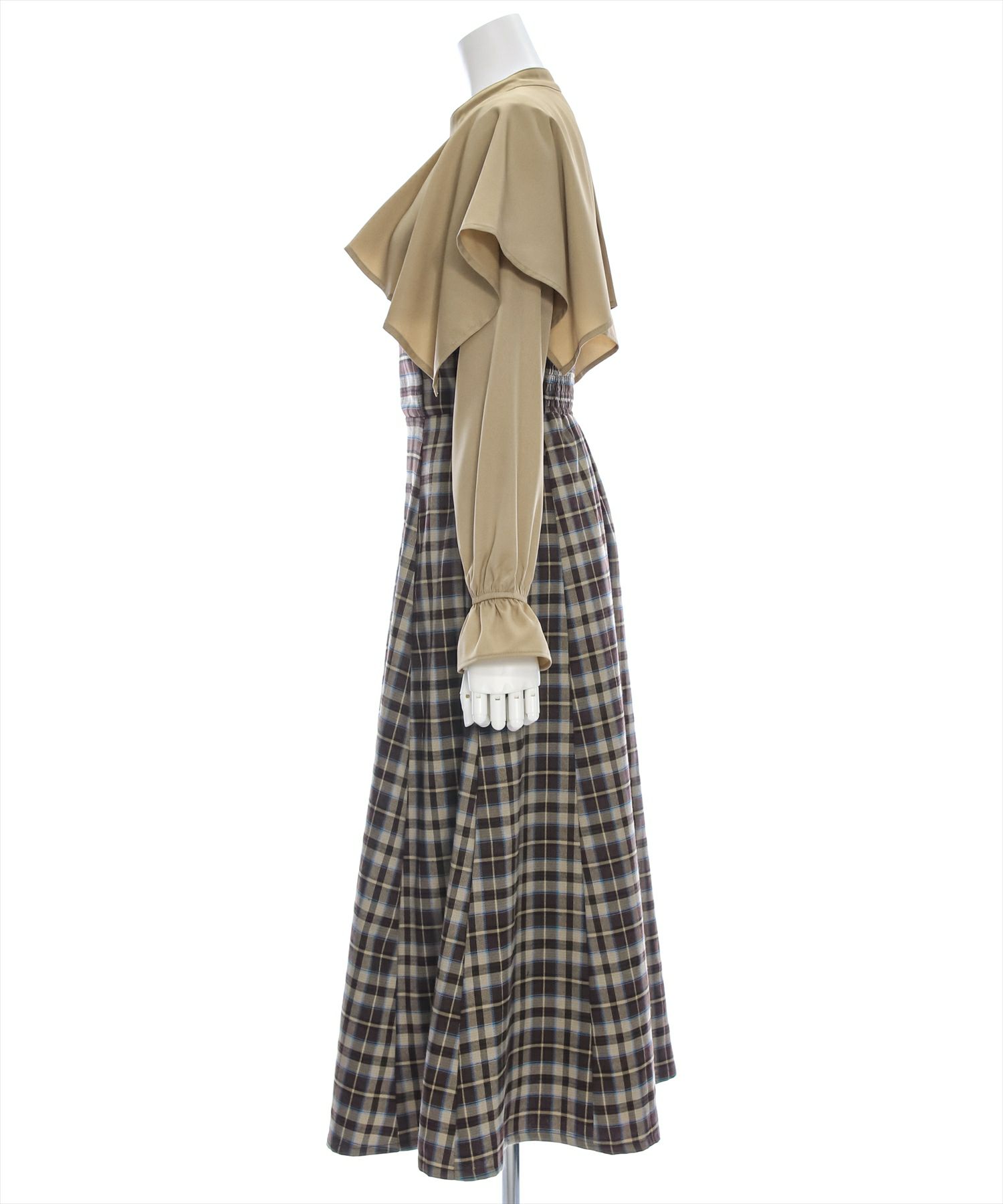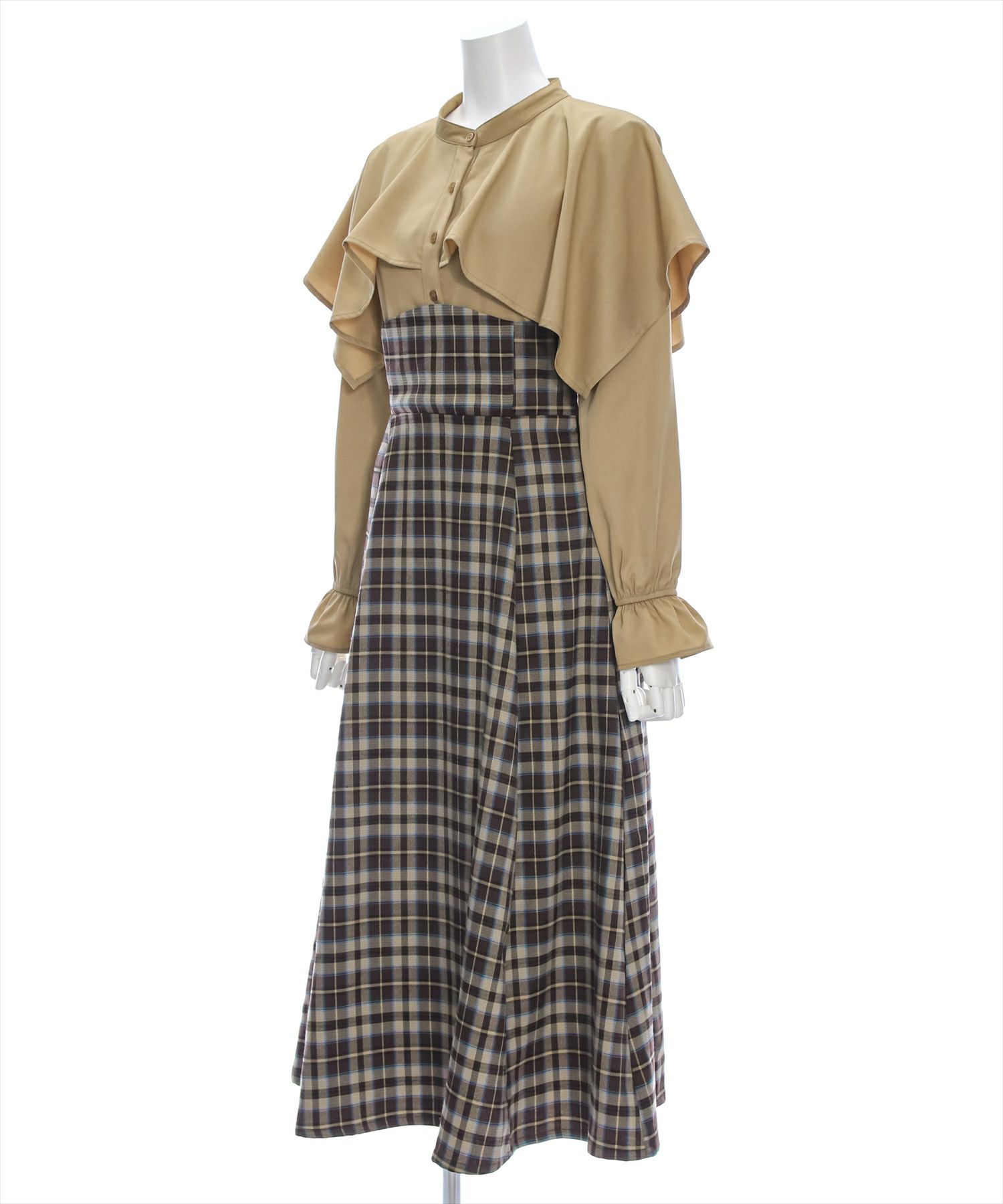 clear ケープ風チェック柄ドッキングフレアロングワンピース[CL8815]