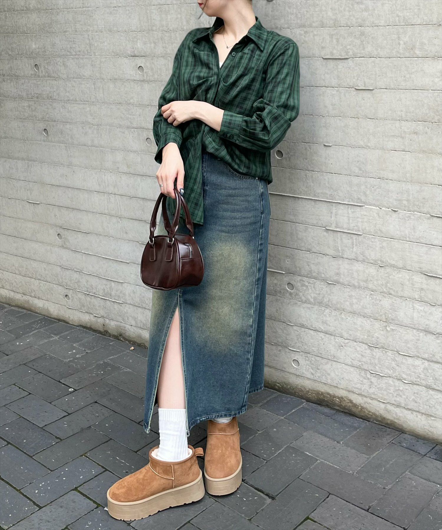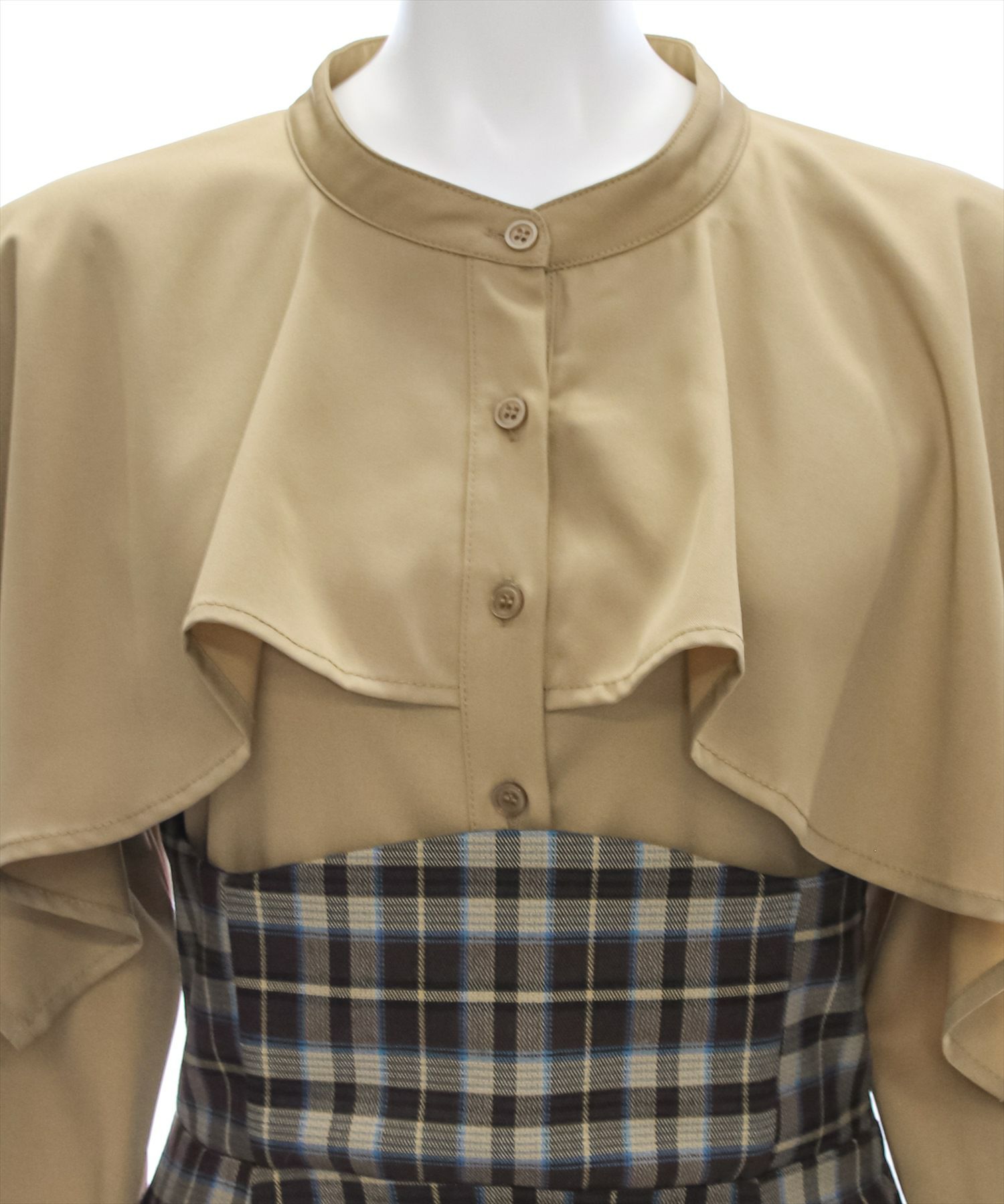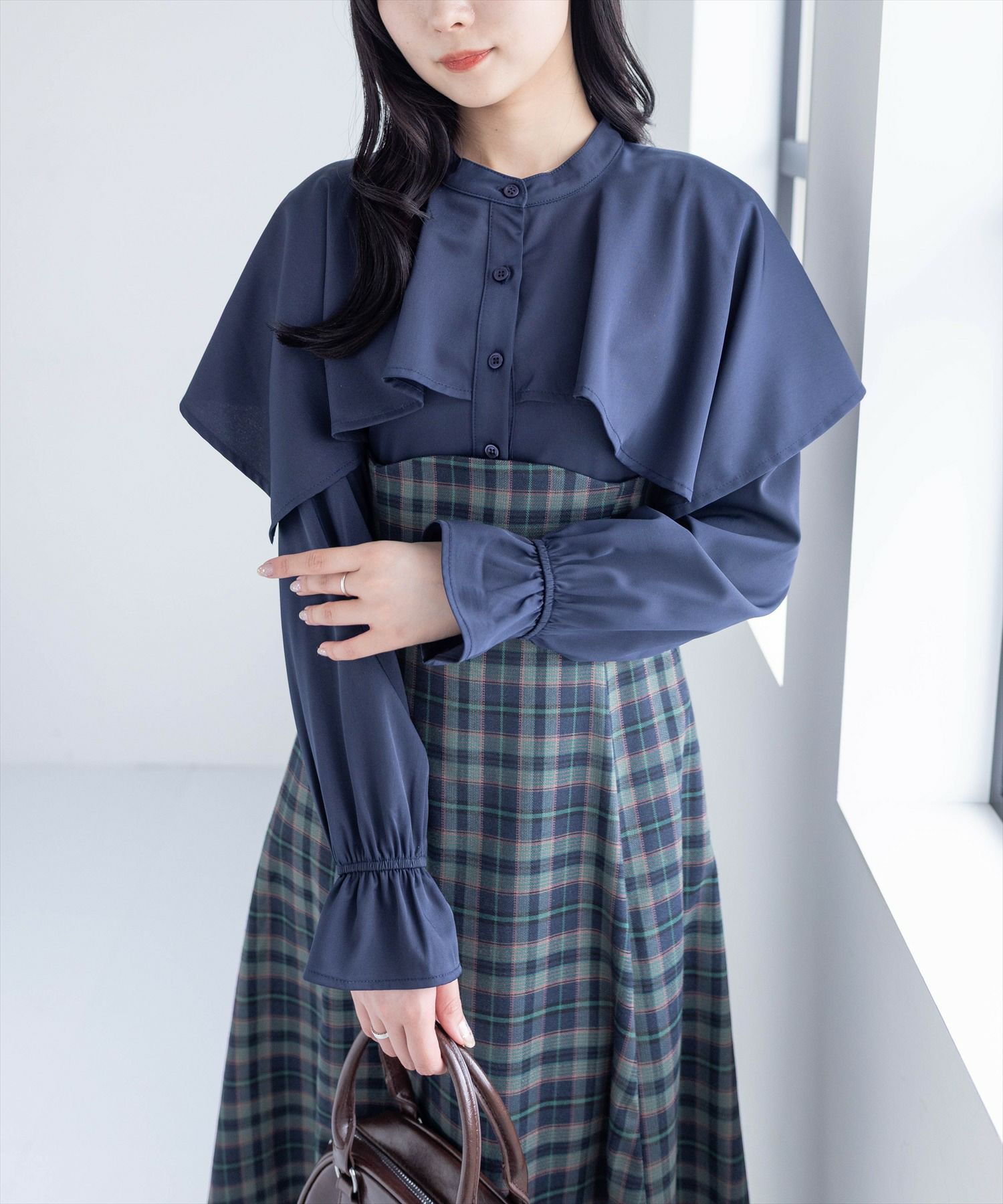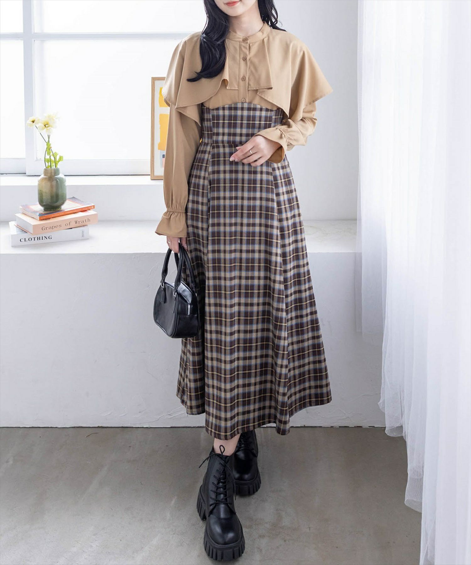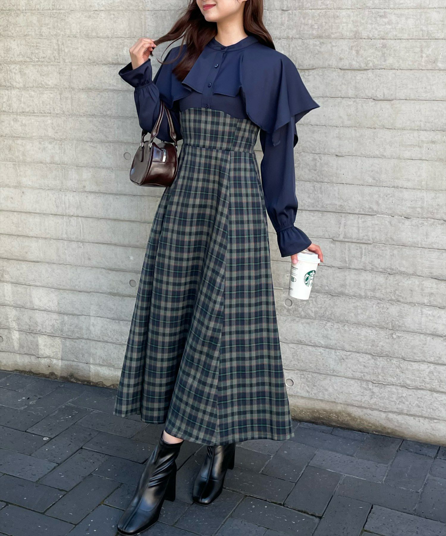 clear ケープ風チェック柄ドッキングフレアロングワンピース[CL8815]