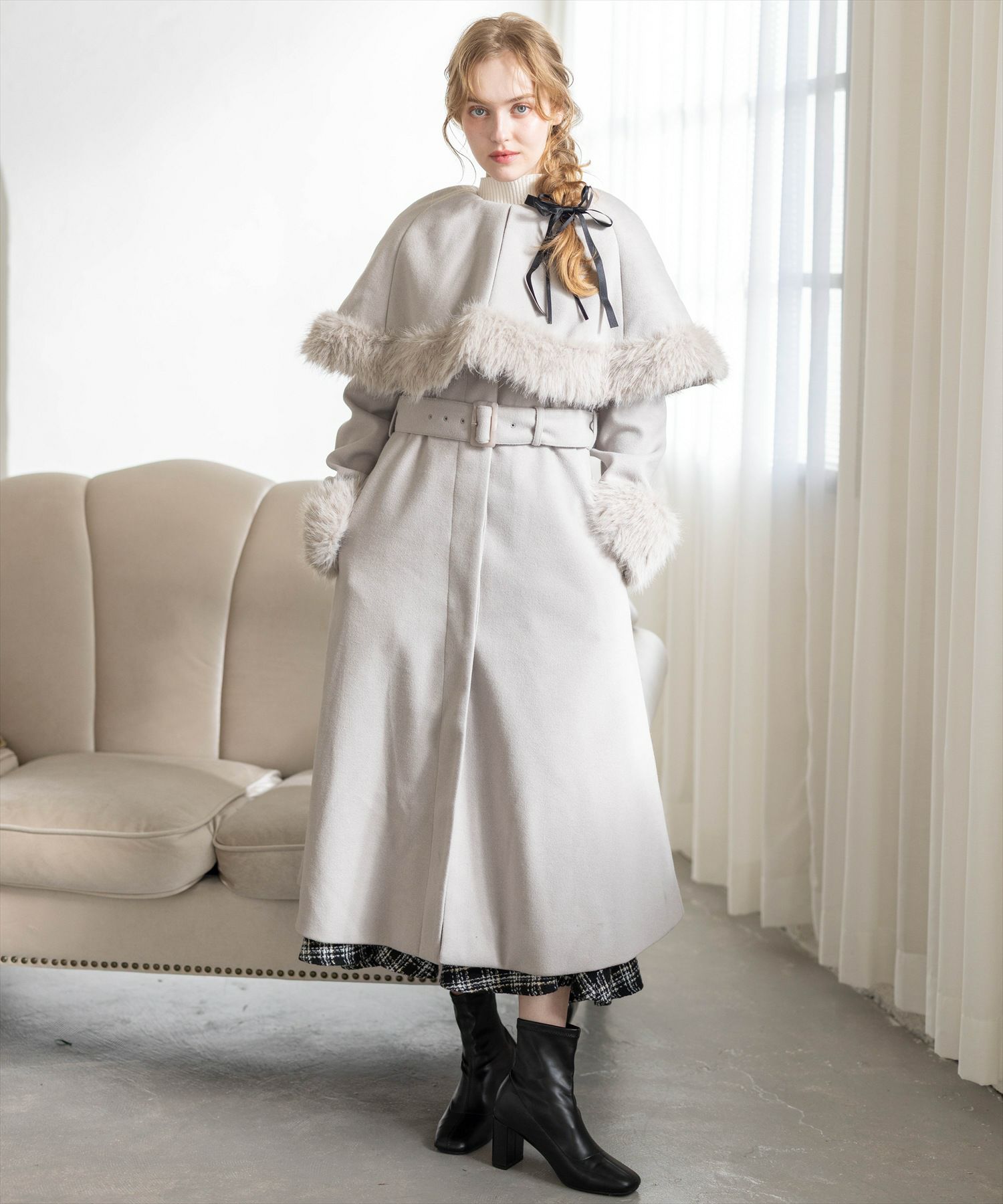 ふわりと広がるケープにファーをあしらった華やかなロングコートです。ケープは取り外し可能で、シンプルなノーカラーコートとしても着られる2way仕様。付属のベルトでウエストマークすれば、スタイルアップも叶います。
