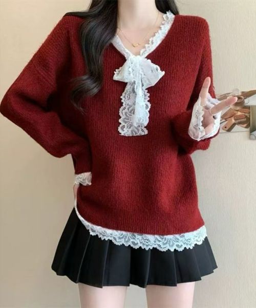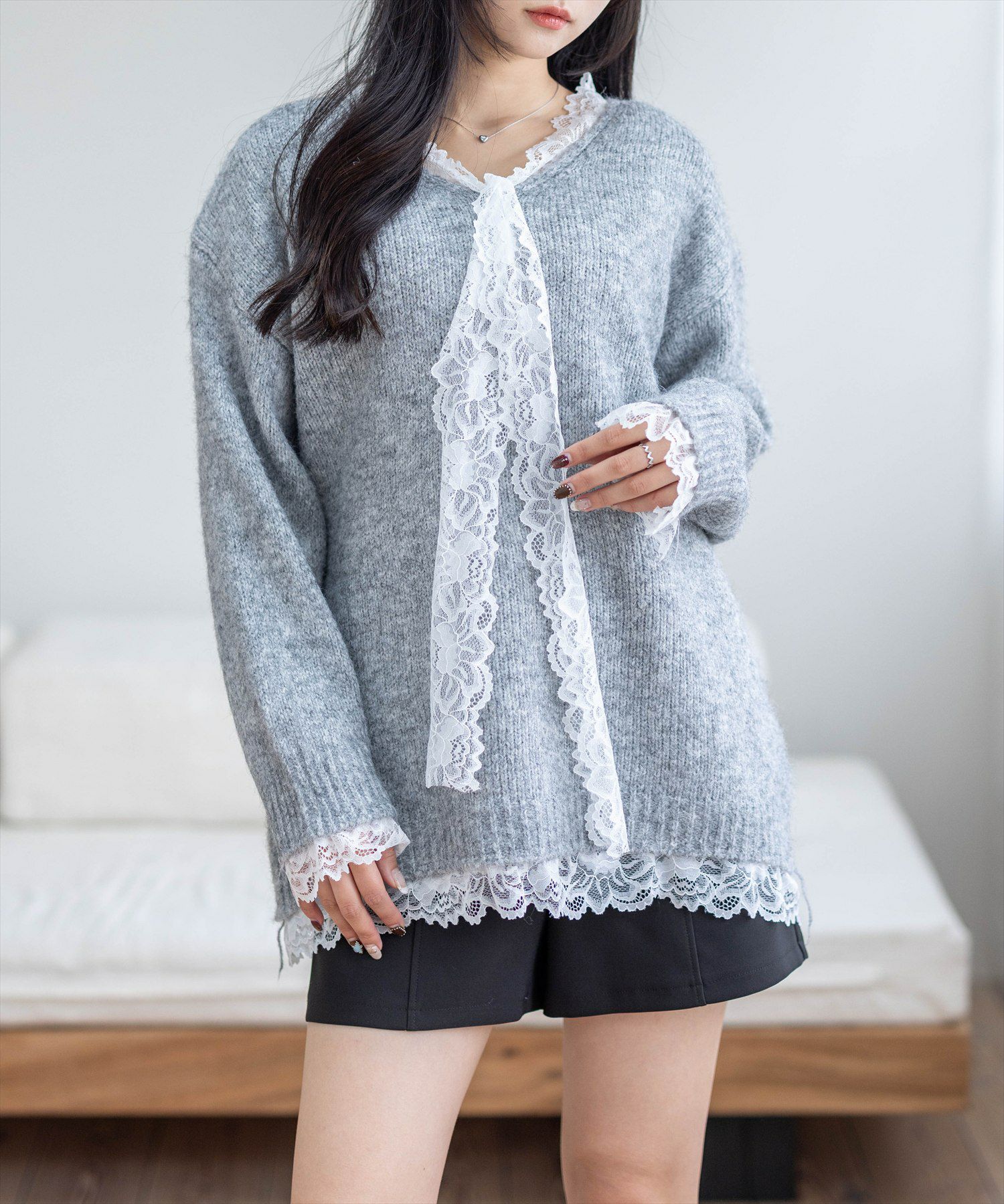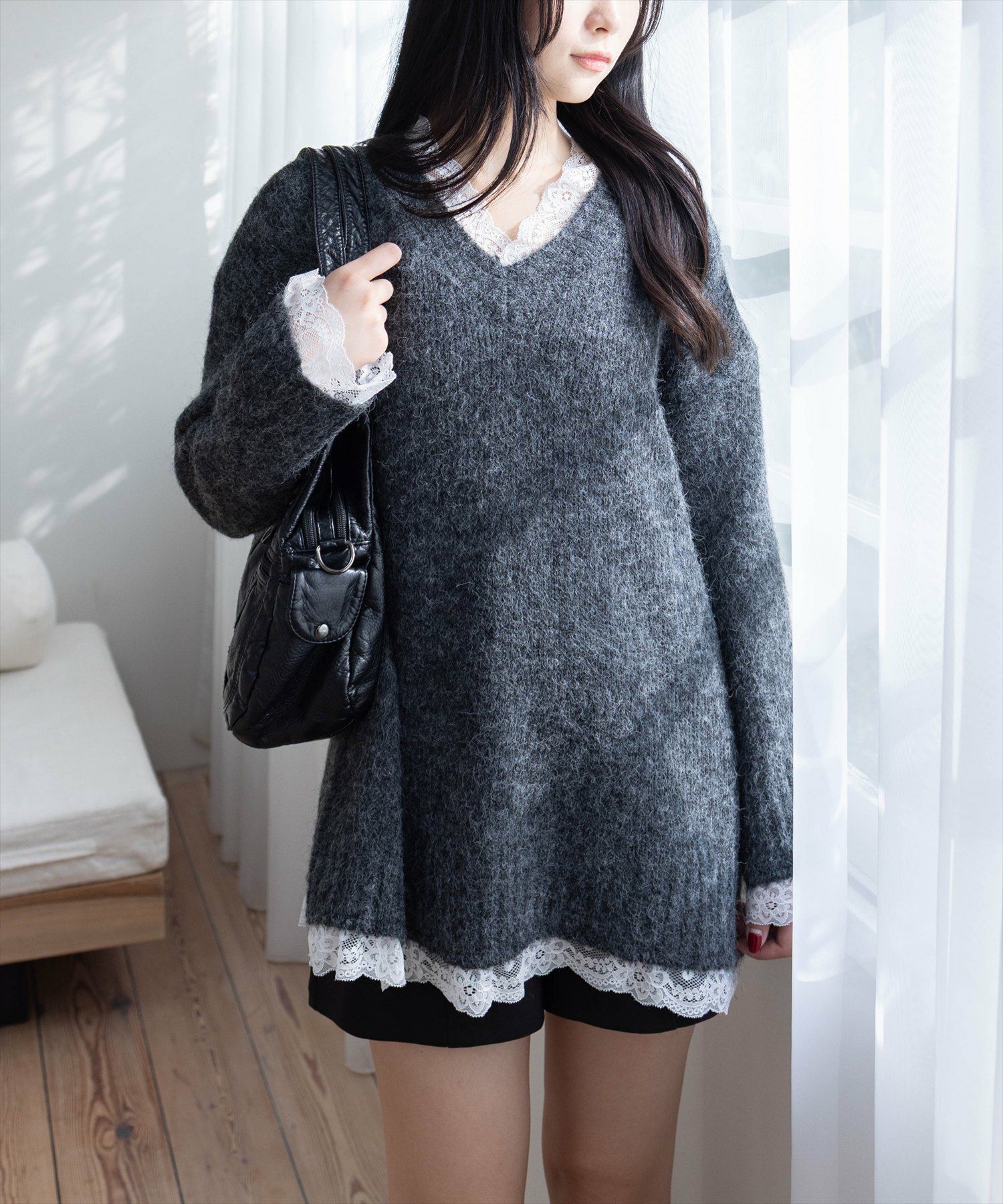 STAY MOTION≪WEB限定/AW新作≫レース付きVネックニットトップス[ST1069]