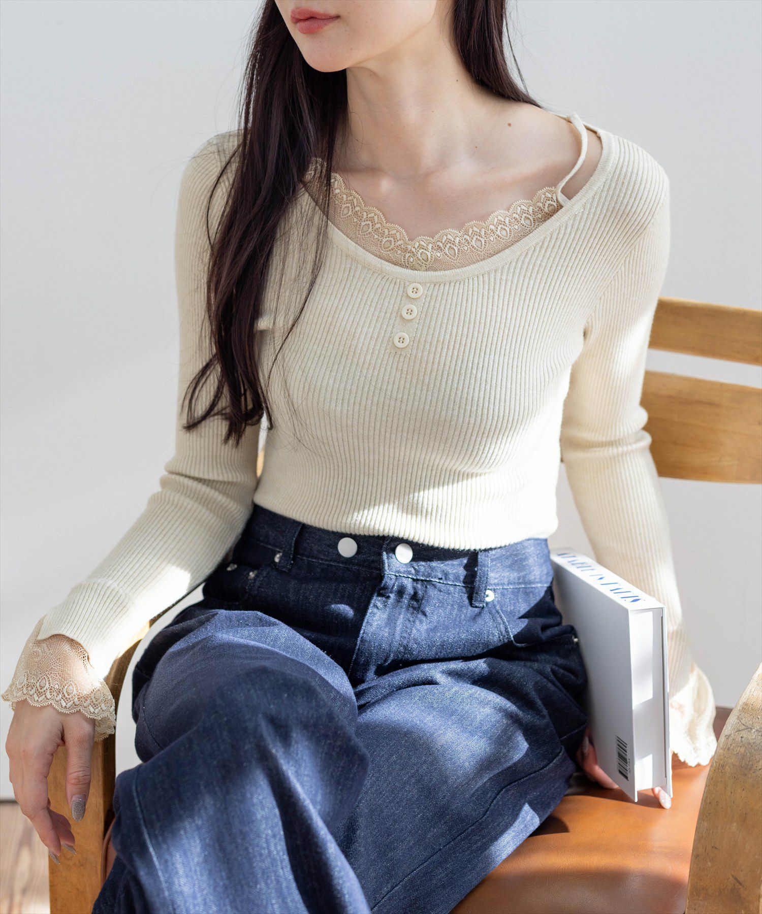 STAY MOTION≪WEB限定/AW新作≫袖口レースニットトップス[ST1088]