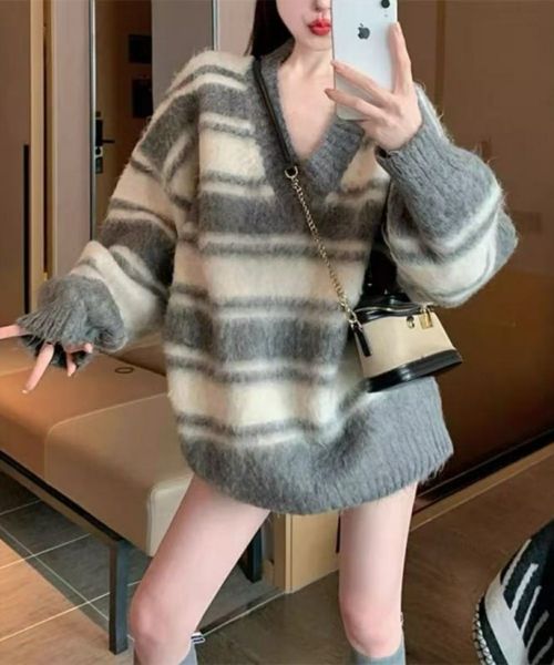 STAY MOTION≪WEB限定/AW新作≫ボーダー柄Vネックニットトップス[ST1099]