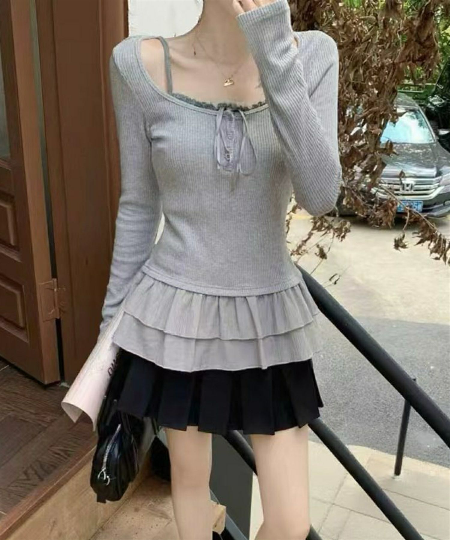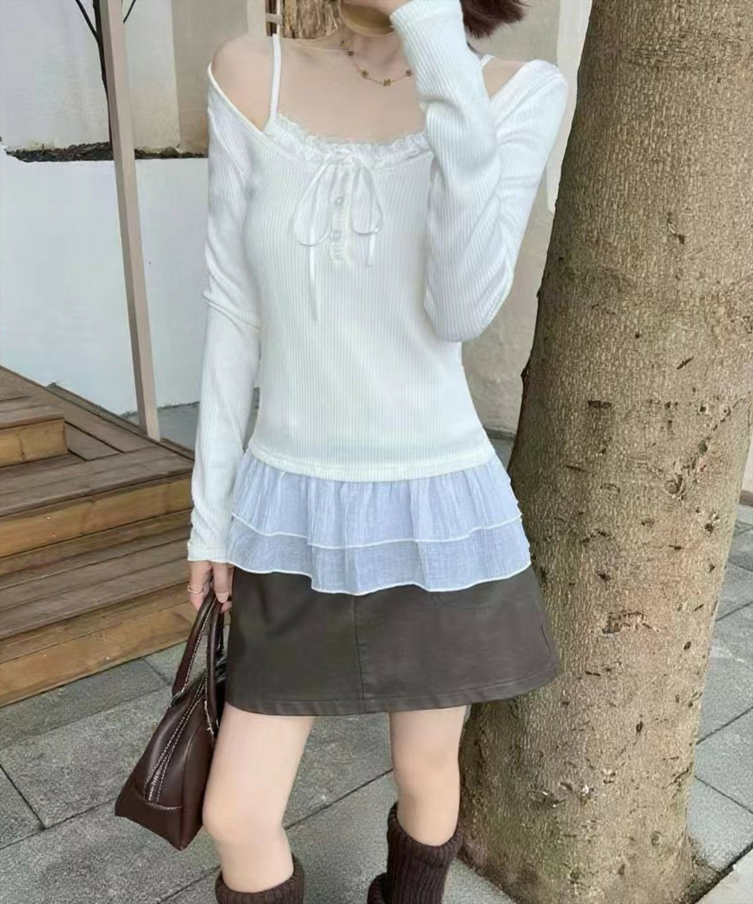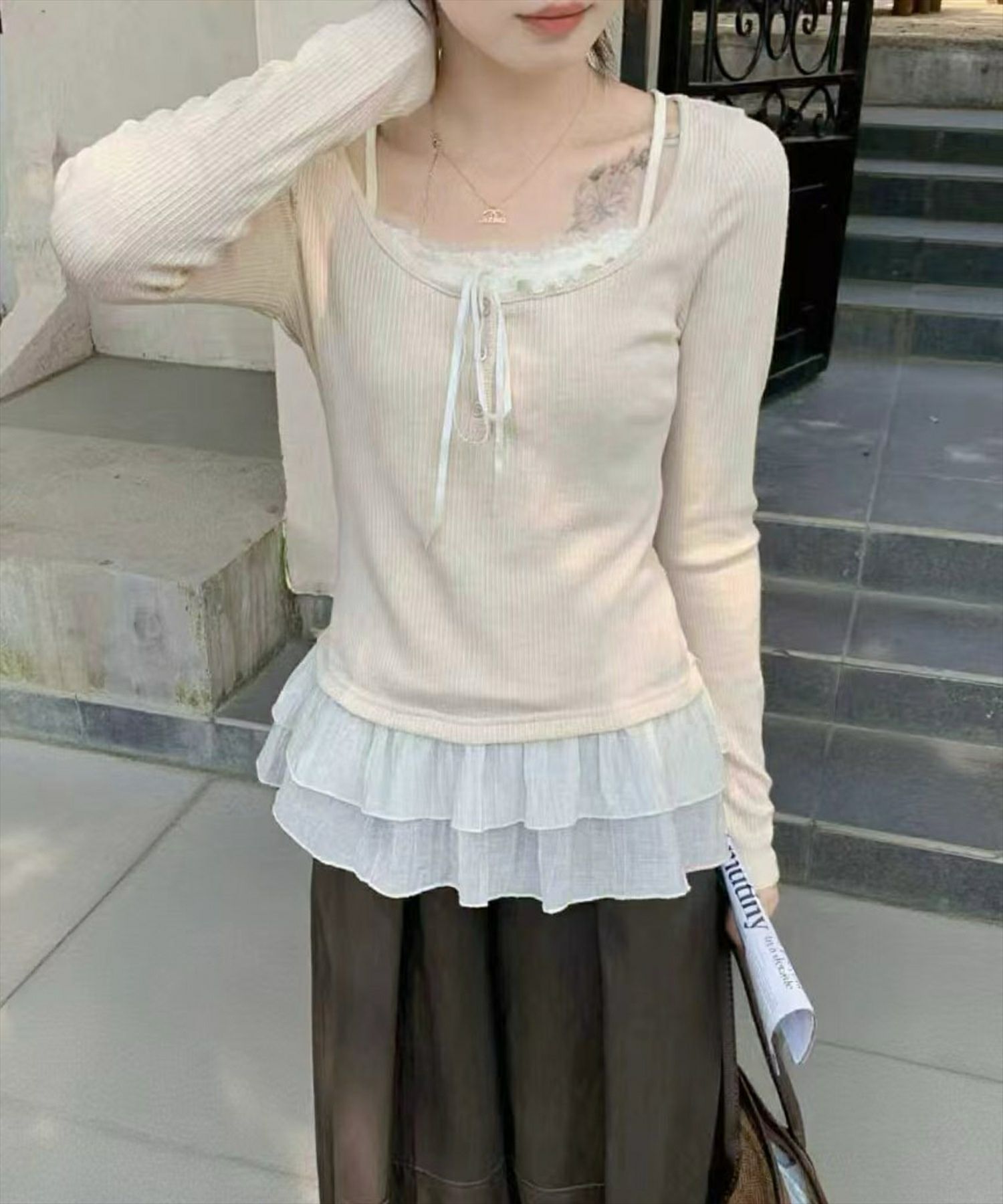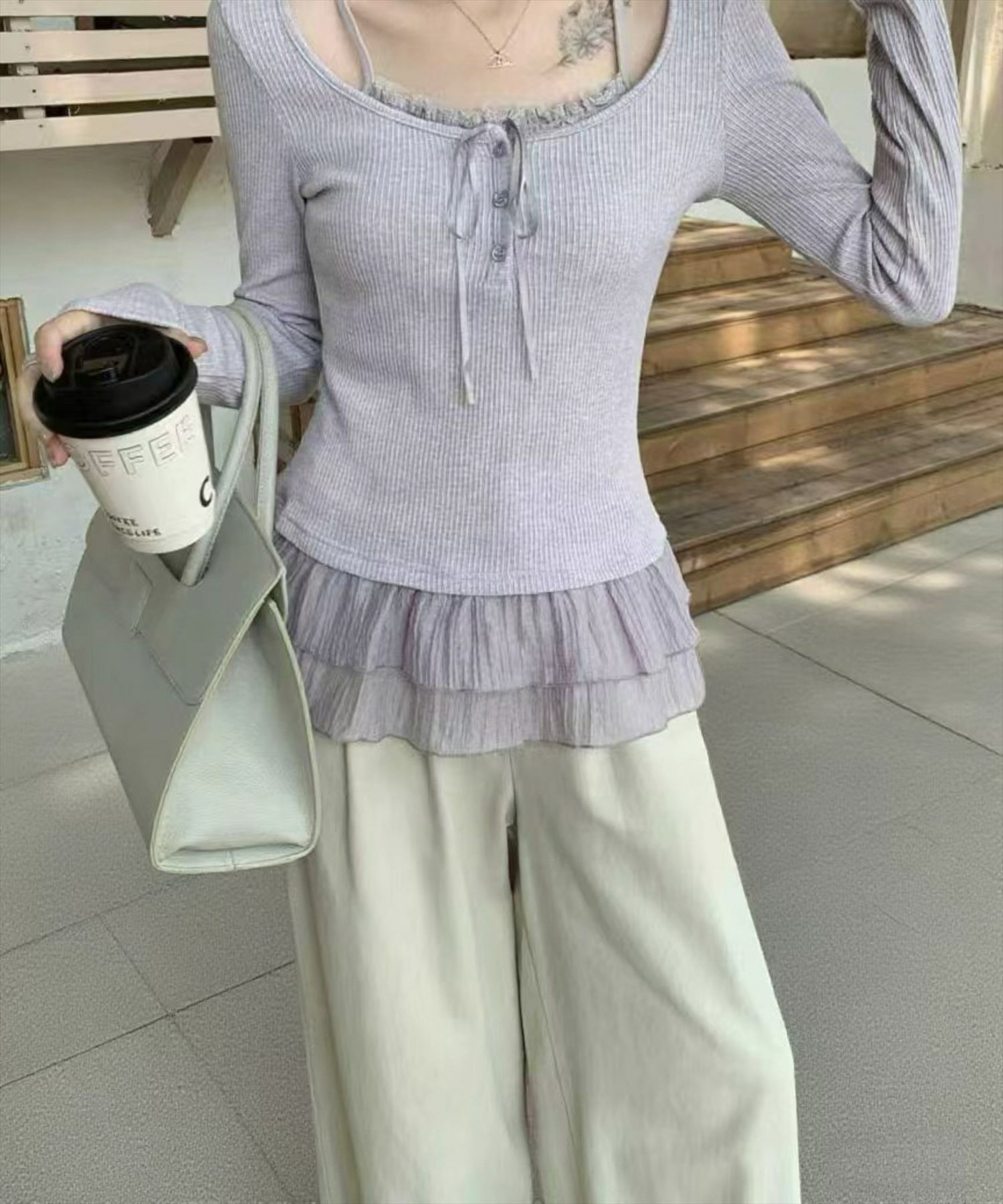 STAY MOTION≪WEB限定/AW新作≫レイヤード風裾フリルリボンカットソートップス[ST1046]