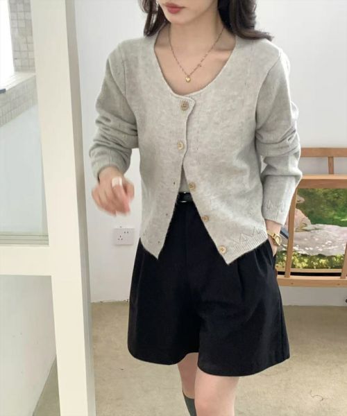 ウッドボタンがアクセントになったニットカーディガンとキャミソールのアンサンブルです。シンプルながらもボタンディテールでナチュラルな可愛さをプラス。キャミとカーディガンがセットになっているので、着回し力が高いアイテムです。
