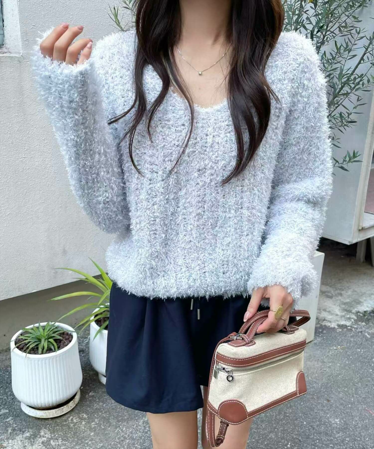 ふんわりとした毛足のあるラメ入りのプルオーバーニットです。シンプルなシルエットながら、光に当たるとさりげなくきらめき、スタイリングに華やかさをプラスします!
