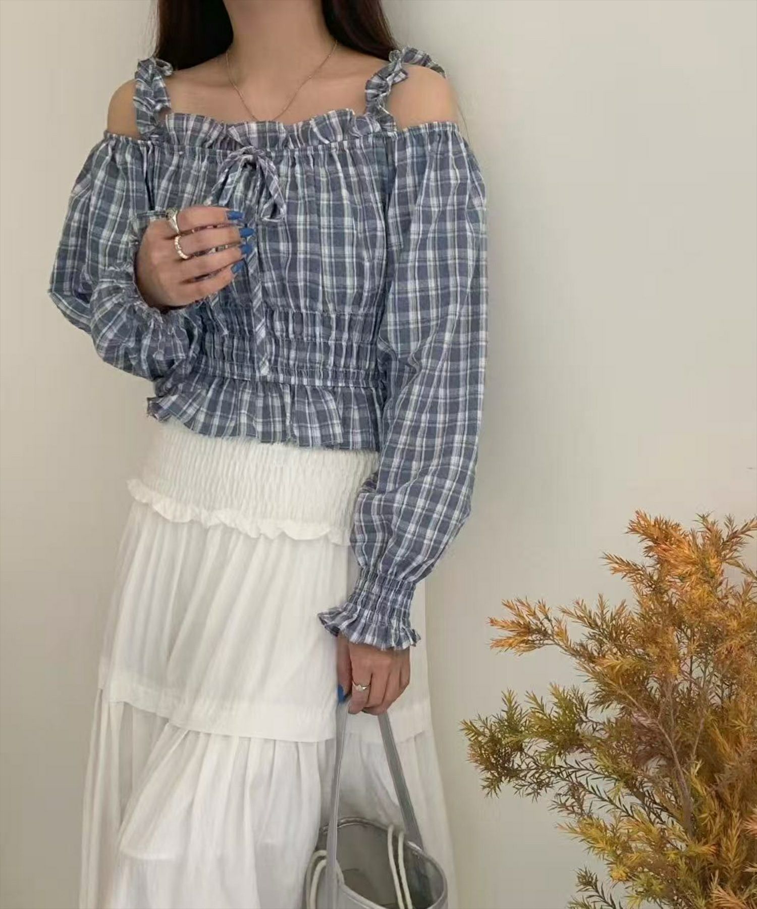 STAY MOTION≪WEB限定/AW新作≫チェック柄リボンオフショルブラウス[ST1017]