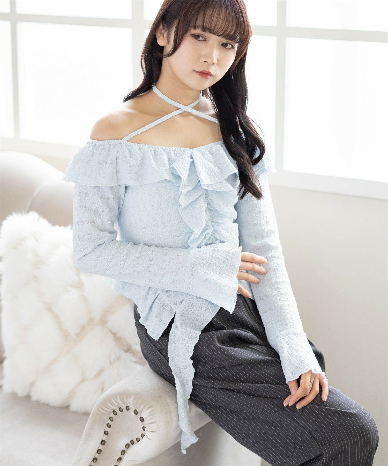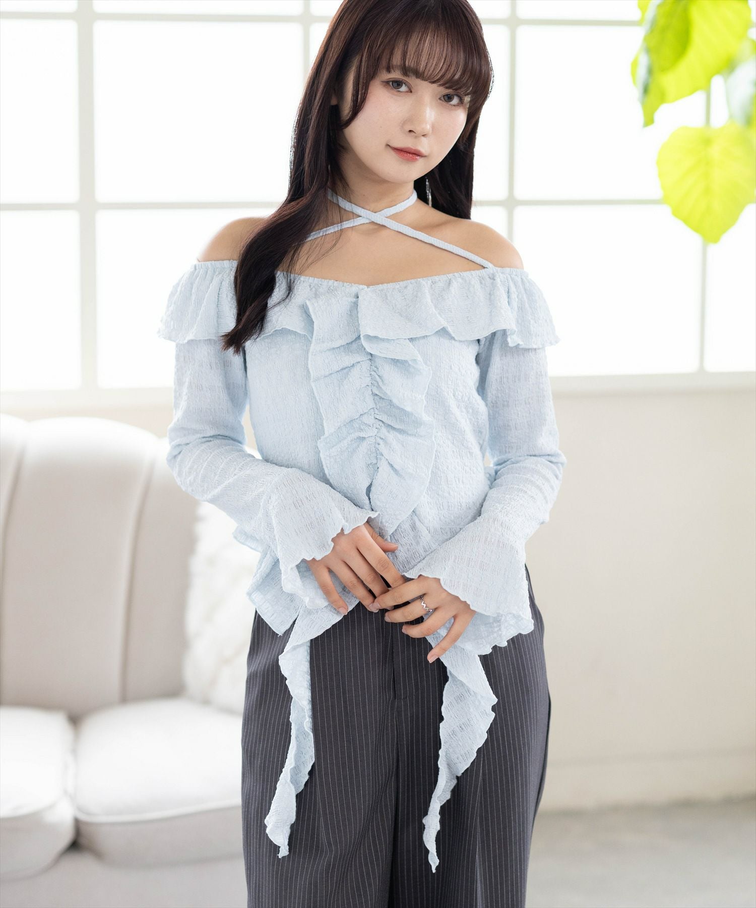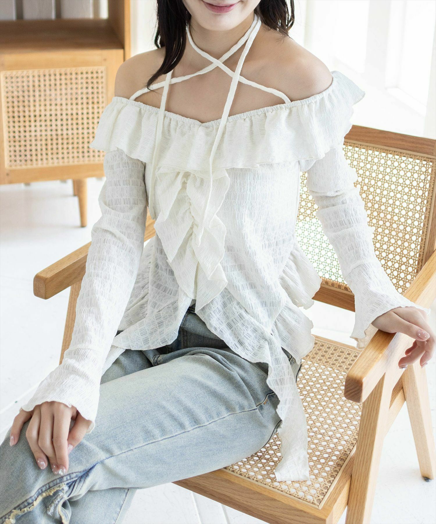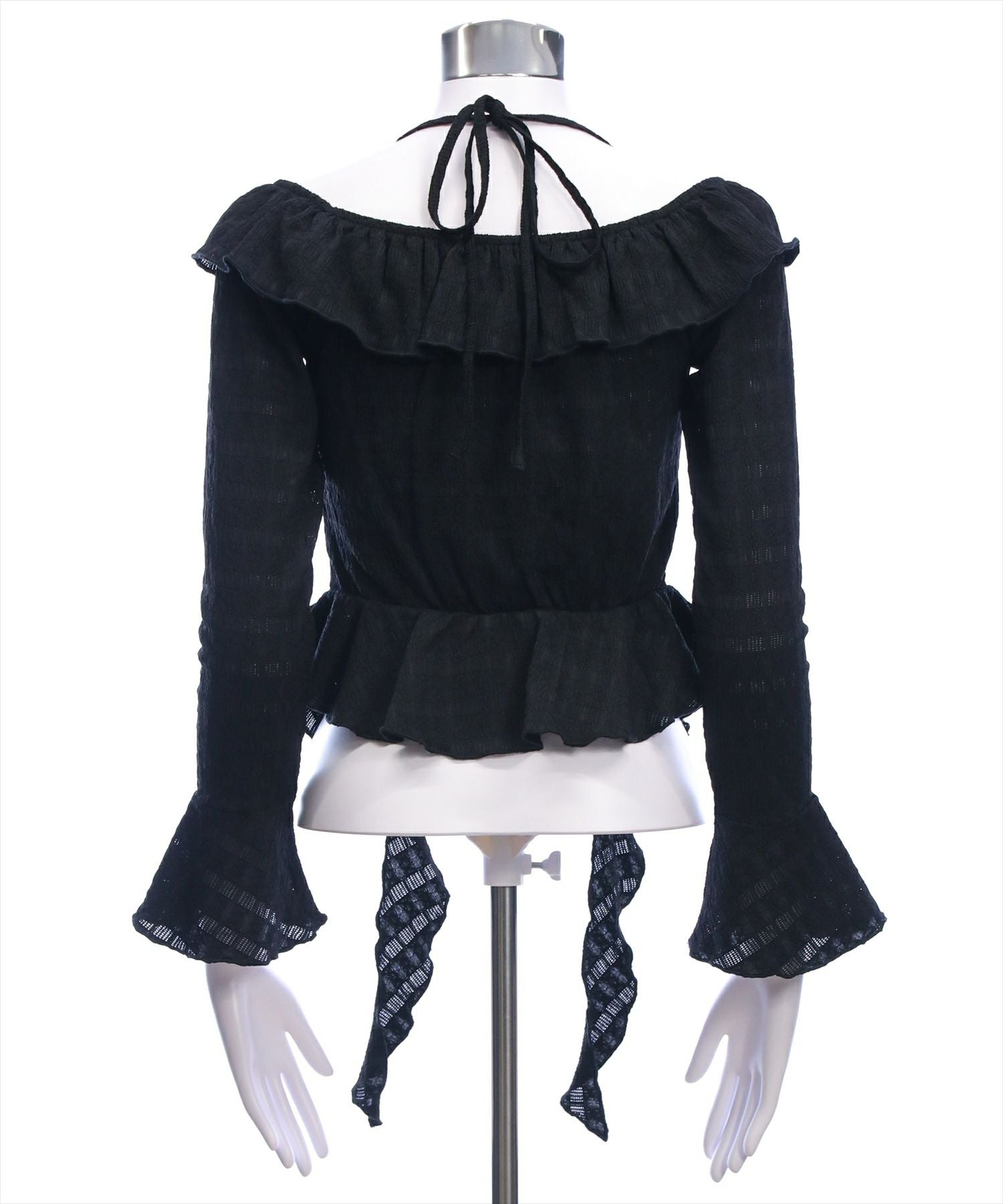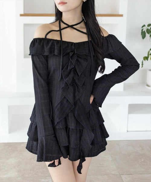 デコルテ美人見え!ネックストラップフリルブラウス