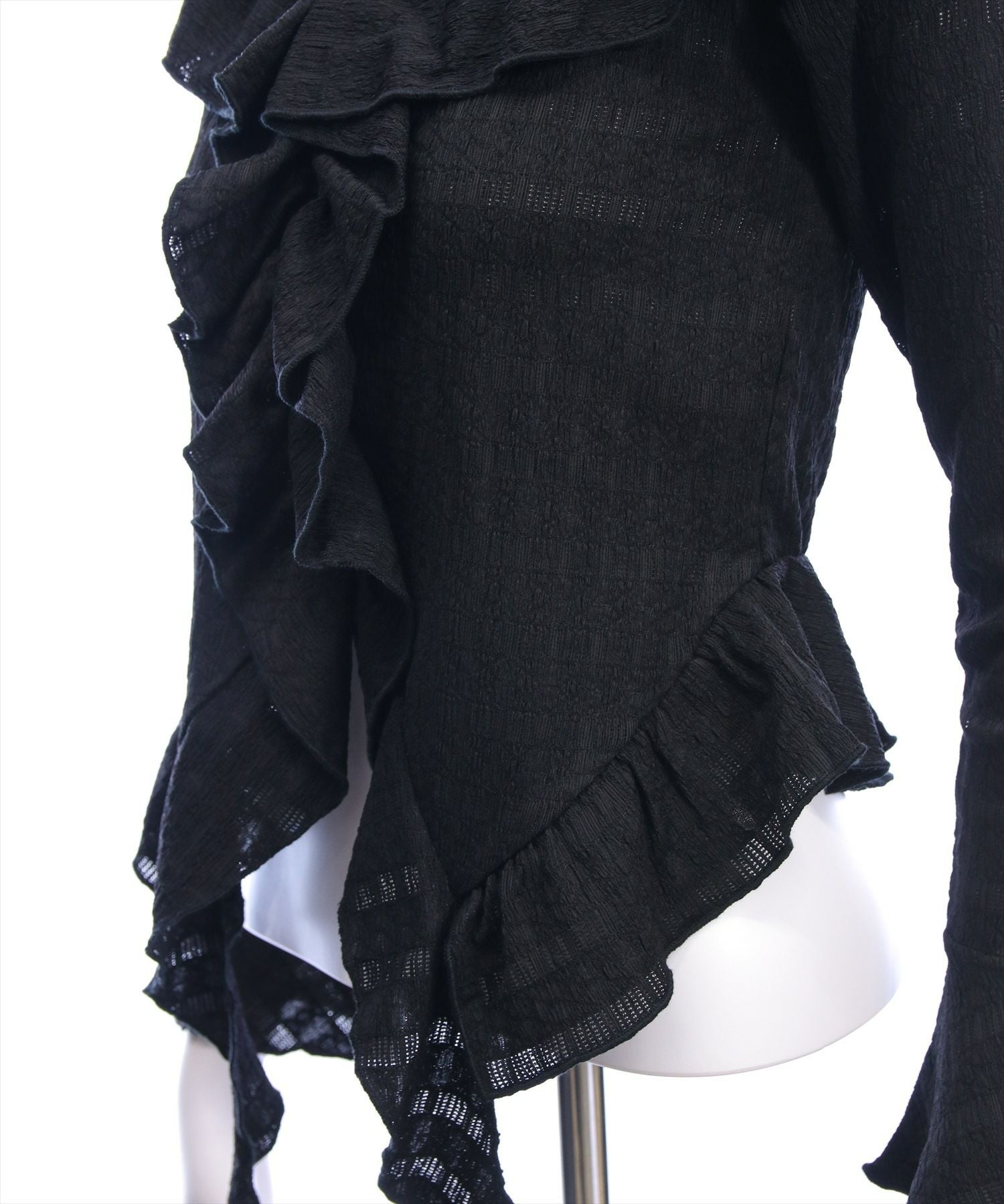 顔まわりに視線を集める、ネックストラップ付きのブラウスが登場!広めに開いたネックラインに細めのストラップがアクセントとなり、上品さと色気を絶妙にミックス。胸元のフリル&リボンディテールがドラマティックで、裾のスカラップカットや袖の揺れ感が女性らしさを引き立てます。可愛さもクールさも楽しめる1枚です。