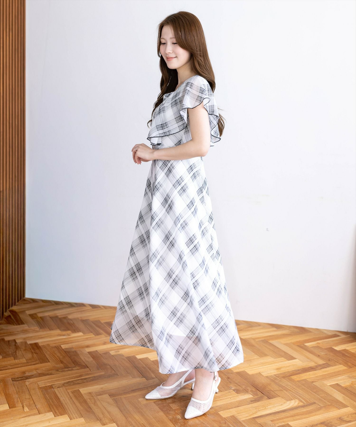 一枚で着映えするデザインなので、足元はパンプスやショートブーツでまとめるだけで完成度の高いスタイルに仕上がります。ジャケットやカーディガンを羽織れば、きれいめなお出かけスタイルにも対応可能です。甘さを抑えたい場合は、シンプルな小物合わせがおすすめです。