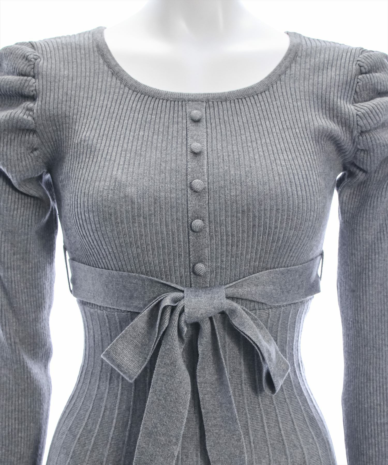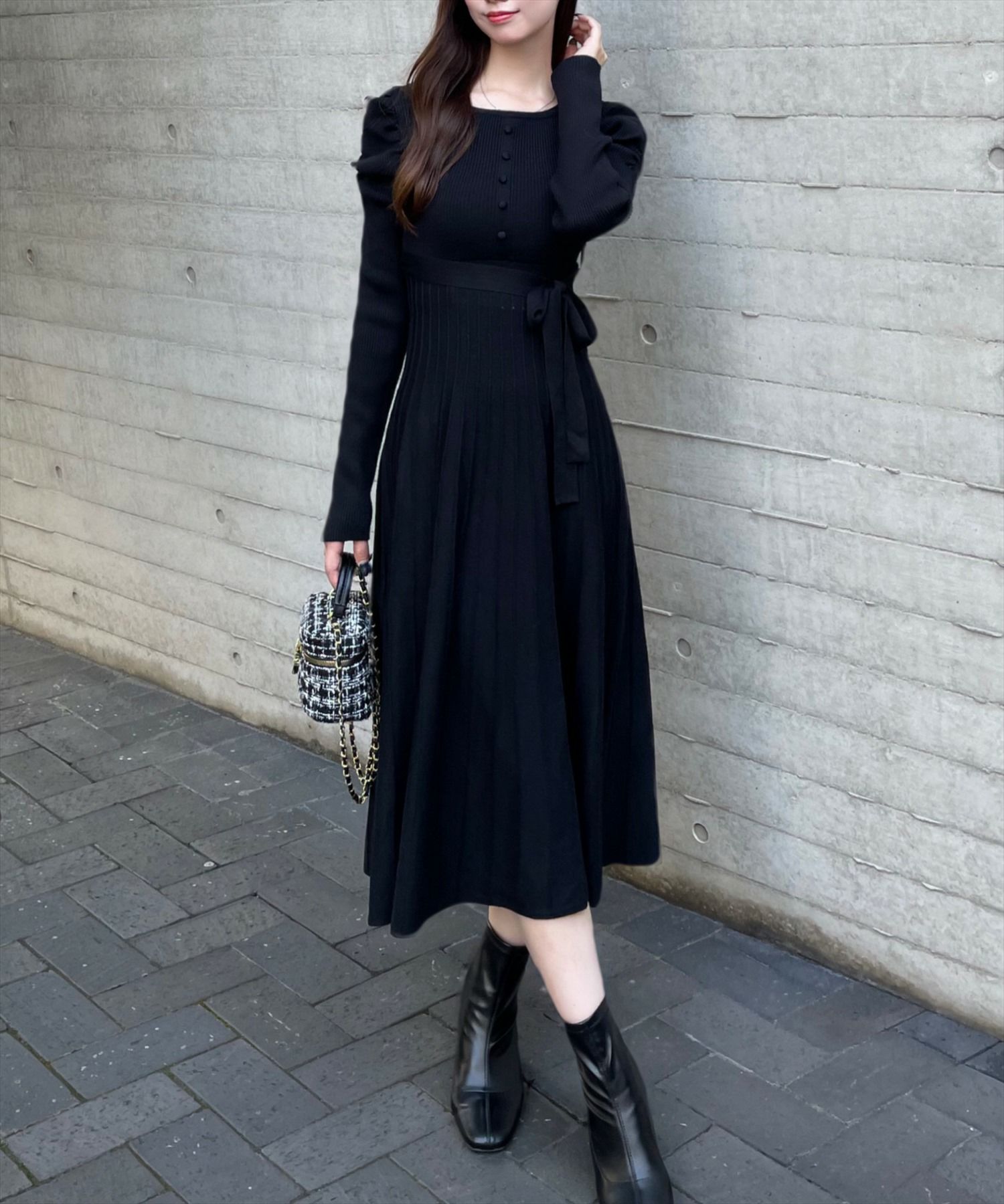 大人可愛い!ウエストリボンニットプリーツワンピース【デザイン】ふんわりと広がるプリーツスカートで上品な印象が叶うニットワンピースです。ウエストリボンを結んでいただくことで、さらにエレガンスな印象になります♪胸元のクルミボタンや肩部分のデザインにもこだわりました!【コーディネート】1枚でコーデが完成します!ロングコートだけでなく、ファーベスト合わせも◎足元はショートブーツ合わせがオススメです!