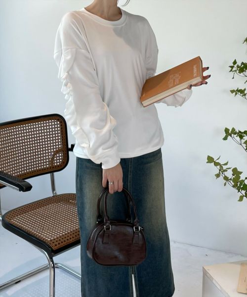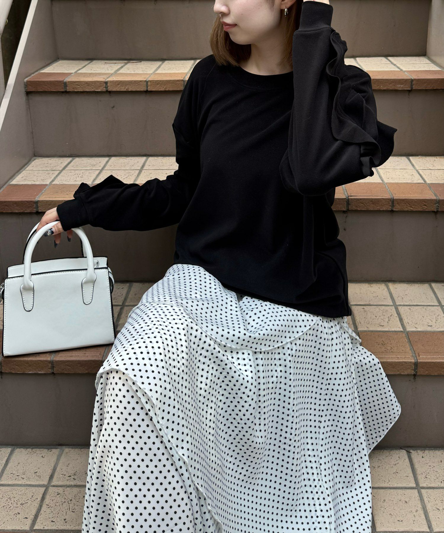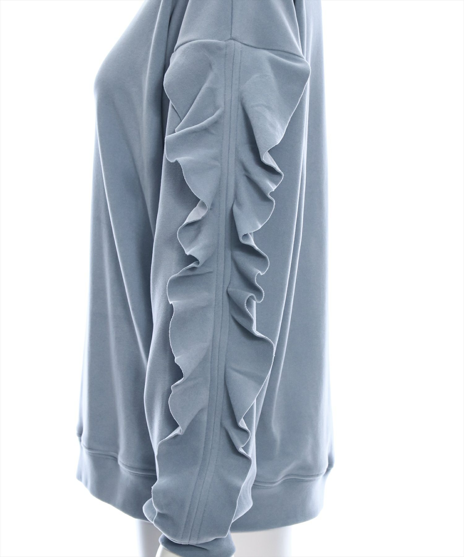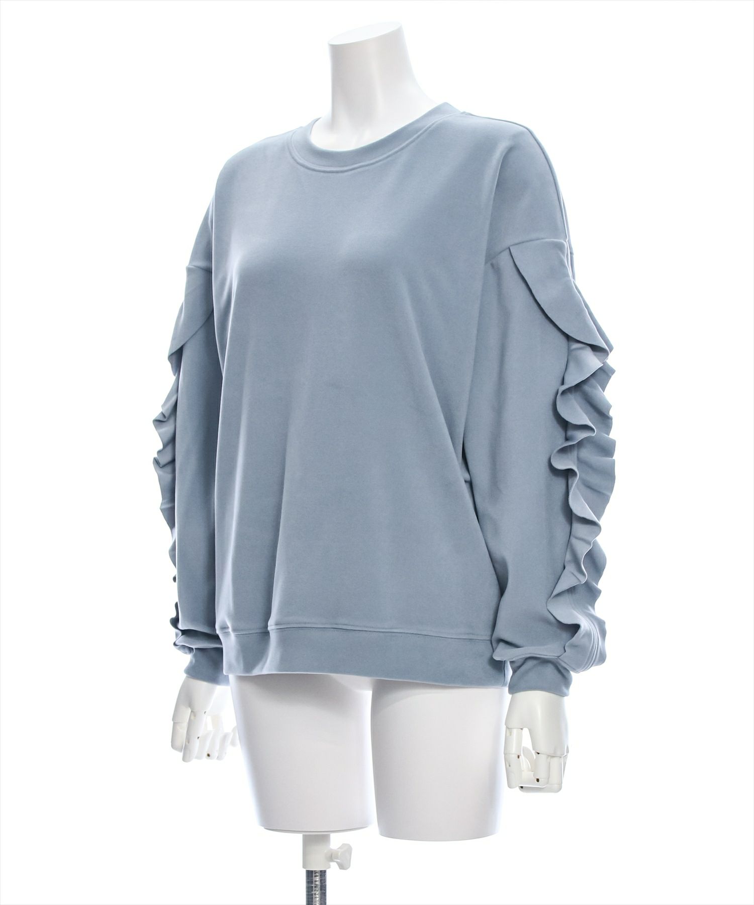 甘めにも着れる!袖フリルスウェットトップス【デザイン】袖のボリューム感のあるフリルが可愛いスウェットトップスです。カジュアルになりやすいスウェットトップスですが、甘めなコーデが叶います♪着丈も長めで気になる部分をカバーできます!【コーディネート】シンプルなデザインなのでどんなボトムスとも相性抜群です!カーゴパンツ合わせでストリートコーデにも、スカート合わせで甘めにも◎