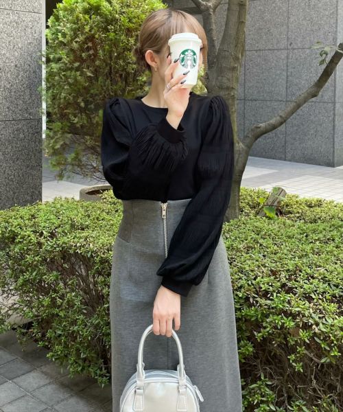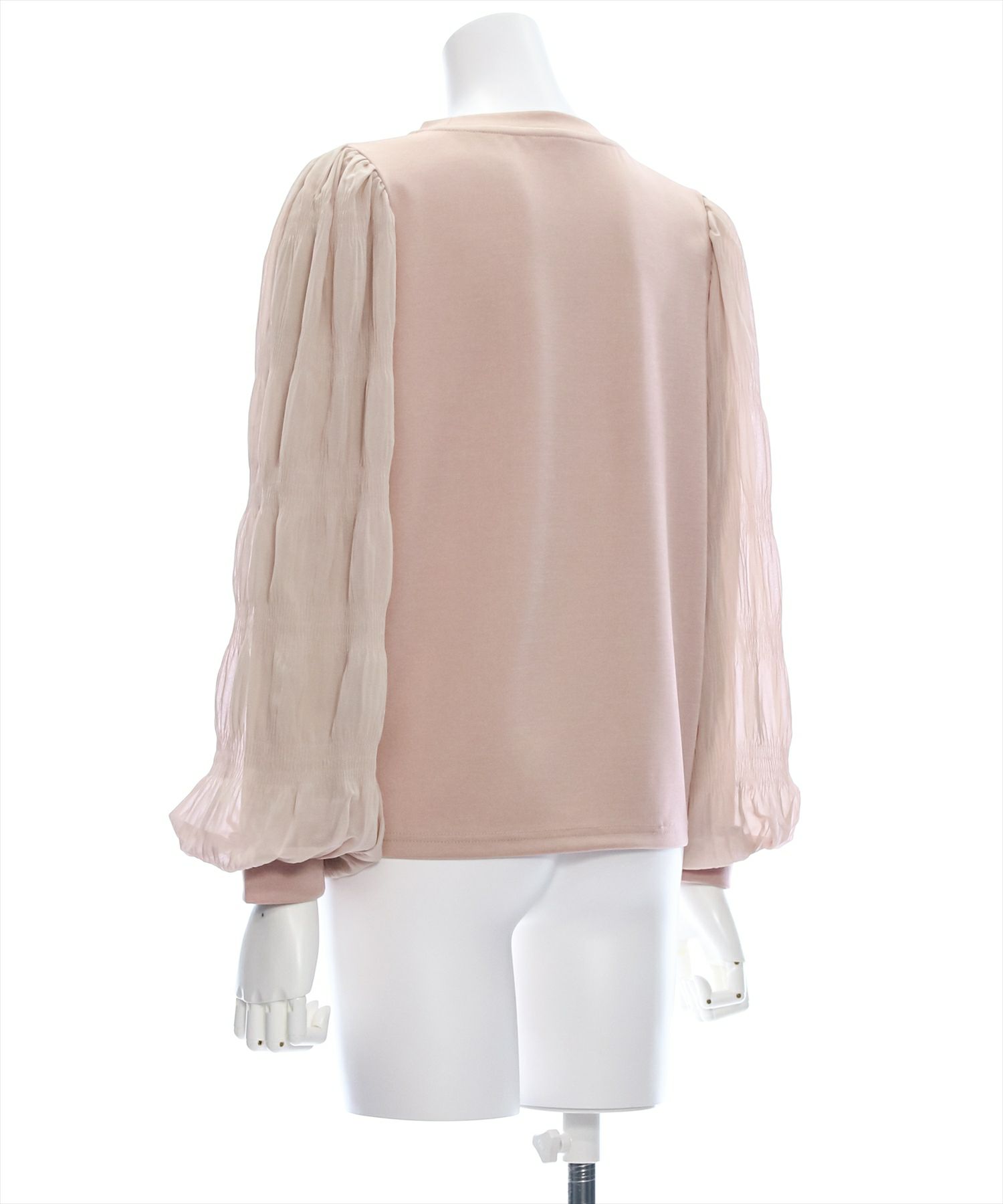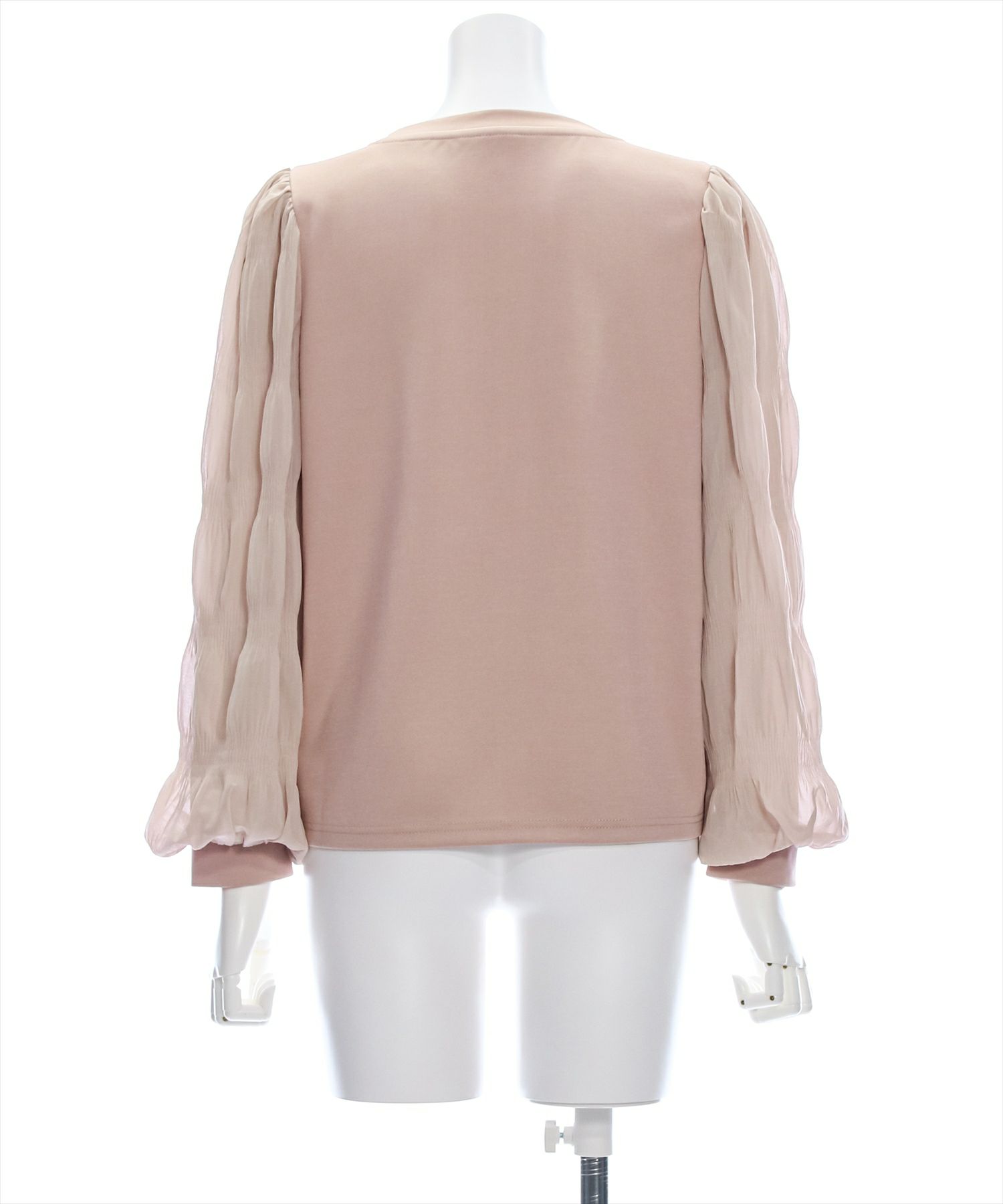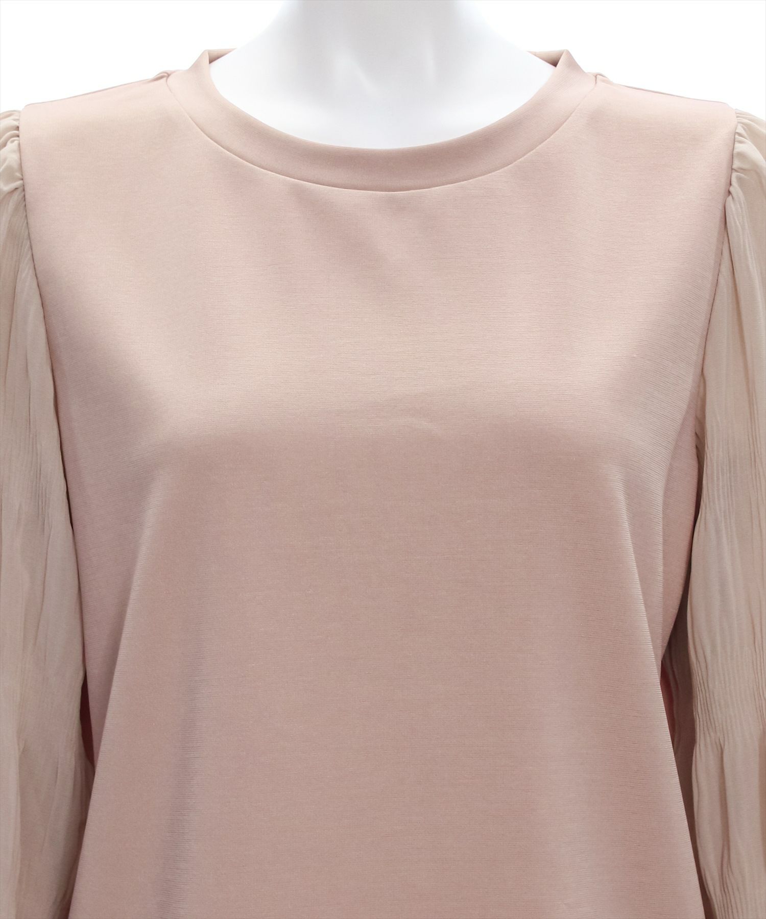 ボリューム感のあるマジョリカプリーツが目を引くトップスです。袖部分は裏地付きで透けにくくなっているのも嬉しいポイントです♪また身頃部分のカットソーは肌触りがよく、着心地も抜群です!