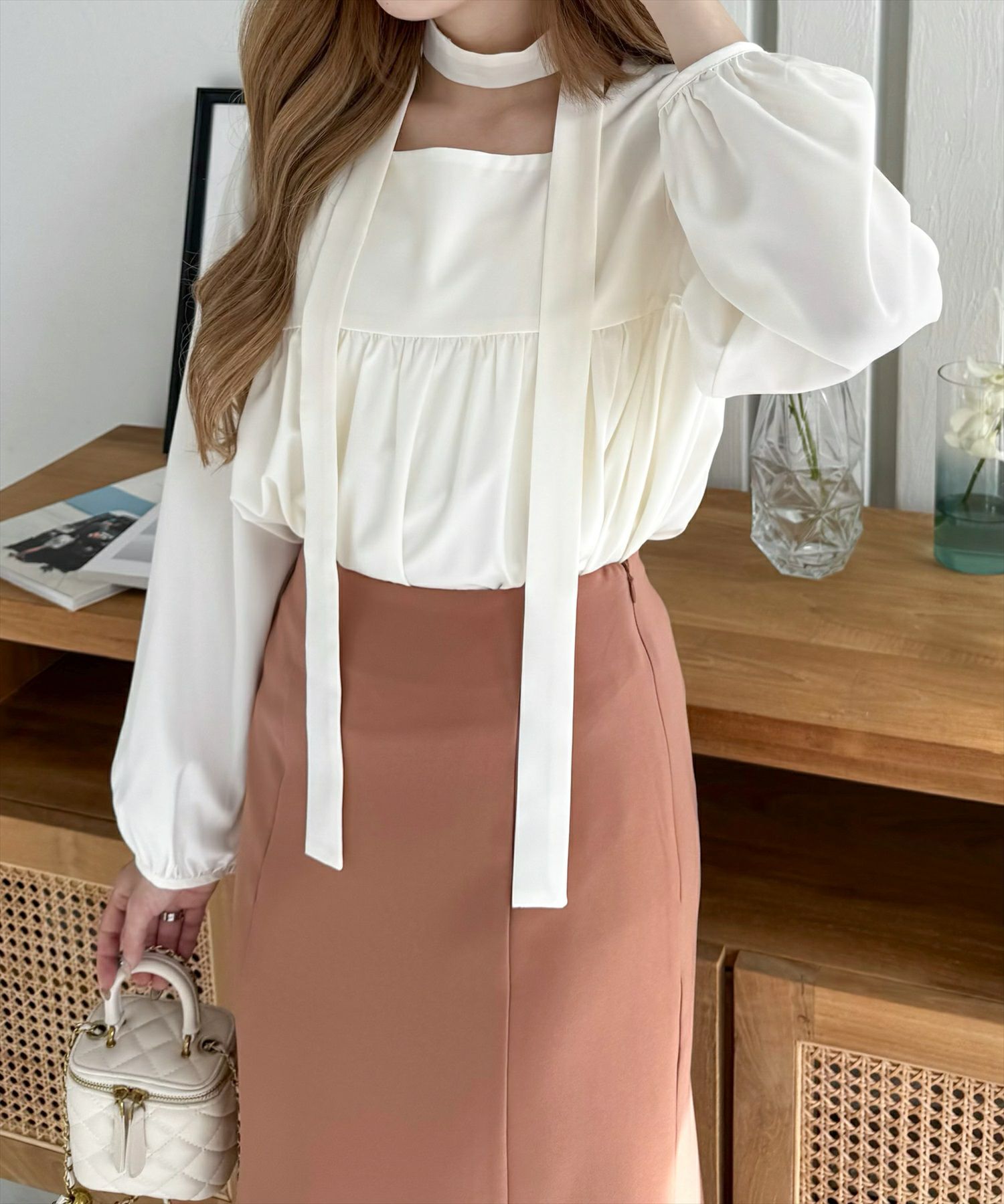 トレンドライクな!スカーフ付きスクエアネックブラウス【デザイン】トレンド感のあるスカーフ付きのブラウスです。スクエアネックなので、デコルテラインを綺麗に見せていただけます!さらに、ふんわりとした裾で女性らしいシルエットが叶います♪【コーディネート】ボリューム感のあるブラウスなので、テーパードパンツやスキニーパンツがオススメです!カジュアルに着こなしたい方は、デニムパンツ合わせも◎