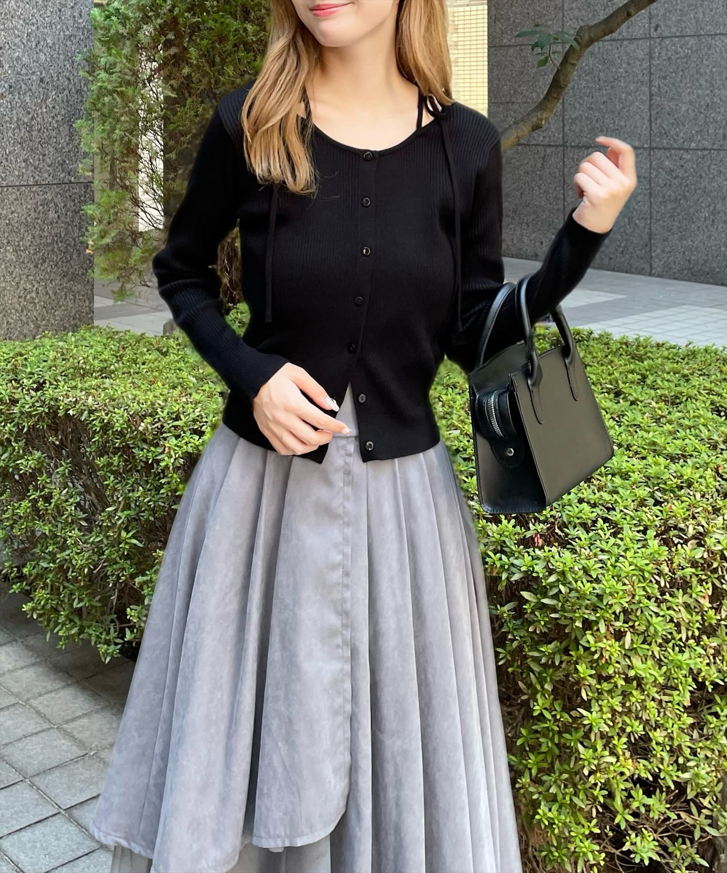 幅広いコーデが叶う!肩リボンニットカーディガン【デザイン】1枚でもデザイン性があり、コーデのポイントになるニットトップスです。肩紐のリボンは長節可能なのも嬉しいポイントです♪フロントのボタンを開けてカーディガンとしても着まわしていただけます!【コーディネート】どんなトップスとも相性抜群です!デニムパンツ合わせでカジュアルにも、フレアスカート合わせで大人フェミニンにも◎