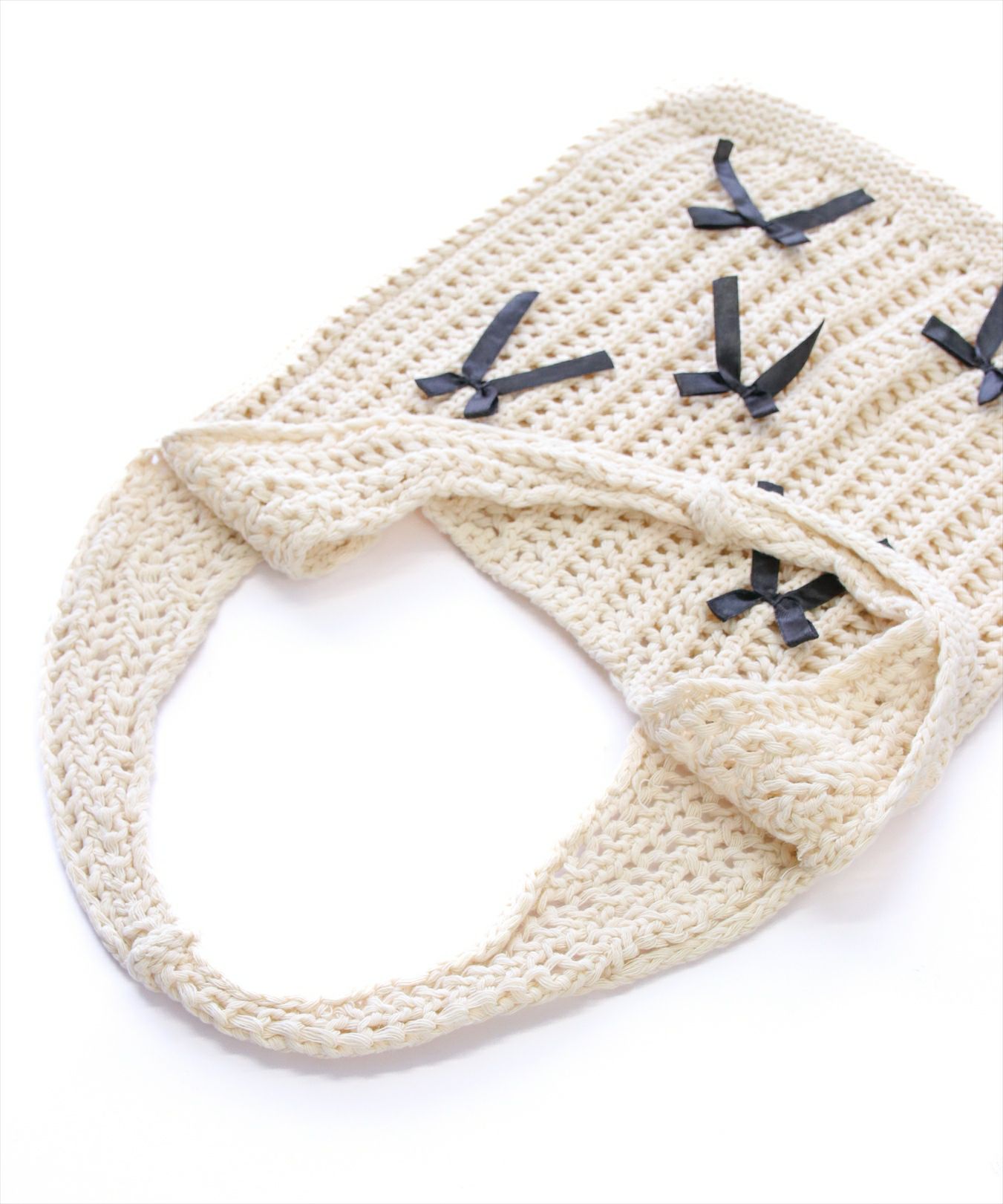 幅広いシーンで大活躍♪リボンモチーフニットトートバッグ。柔らかなニットなので持ちやすく、折りたためるので持ち運びに便利!エコバックとしてデイリー使いもしやすく、旅行先でのサブバッグとしてもお使いいただけます◎持つだけで季節感が出るので、普段のコーデを爽やかに演出してくれます!