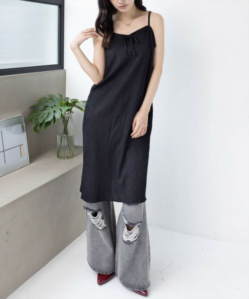 1枚で大人ガーリーに!楊柳シアーキャミアウトレット/アウトレット-ワンピース【デザイン】胸元のリボンデザインがさりげないアクセントになり女性らさを引き立て、抜け感のあるシルエットが魅力?軽くて涼しく、インナーやアウトレット/アウトレット-トップスとの重ね着でコーデの幅が広がります◎【コーディネート】レイヤードスタイルにぴったりで、ロンTやニットとの重ね着で季節問わず着まわせます◎