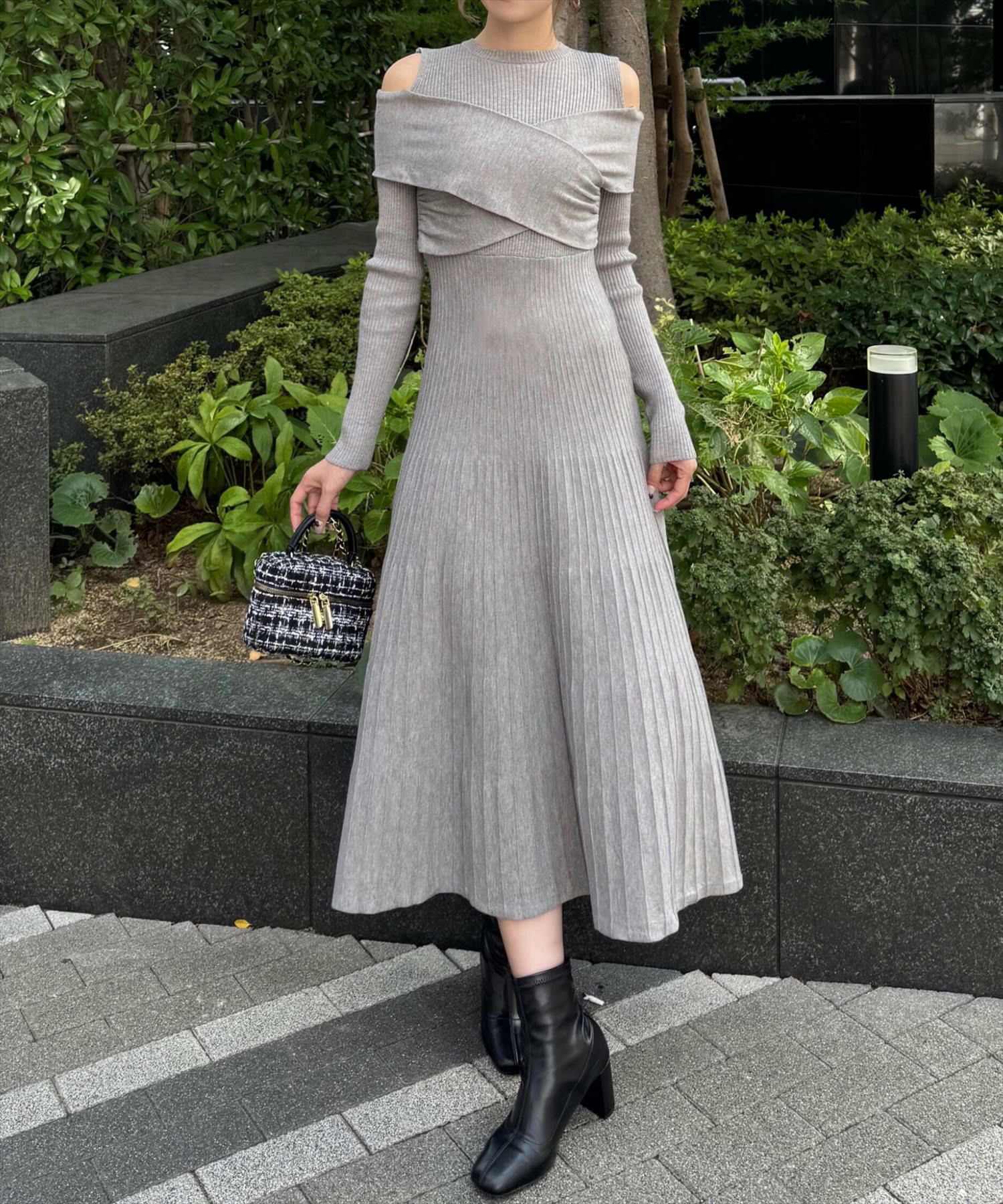 おしとやかな印象に!オープンショルダーフレアロングニットワンピース【デザイン】オープンショルダーで肌見せして二の腕をすっきりと見せてくれます!裾がフレアになっているので、シルエットが綺麗です!フロント部分にデザインがあるので1枚で主役級のワンピースになります♪【コーディネート】ショートブーツやヒールなどで合わせていただくのがオススメです◎きれいめなロングコートやファーコートとの相性抜群です!