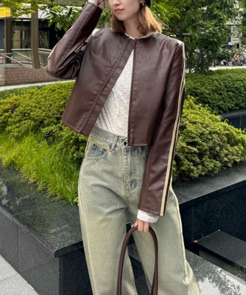 高級感のある!ダブルラインシングルライダース【デザイン】トレンド感のあるラインがほどこされたライダースです。しっかりとした生地感で、高見え間違いなしです!コンパクトなシルエットなので、自然とスタイルアップが叶います♪【コーディネート】ワンピースやミニスカート合わせで。甘辛コーデに仕上げていただくのがオススメです◎インナーとしてハイゲージニットを合わせていただくことで、ロングシーズンご着用いただけます♪