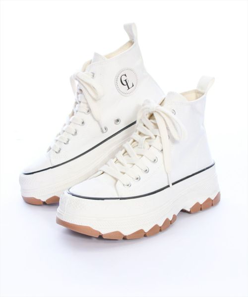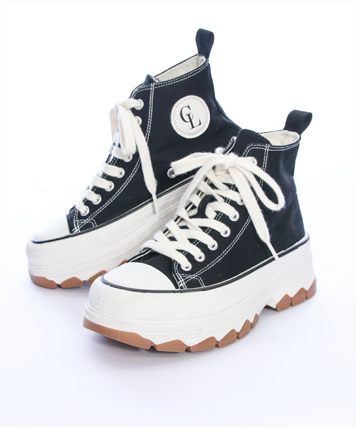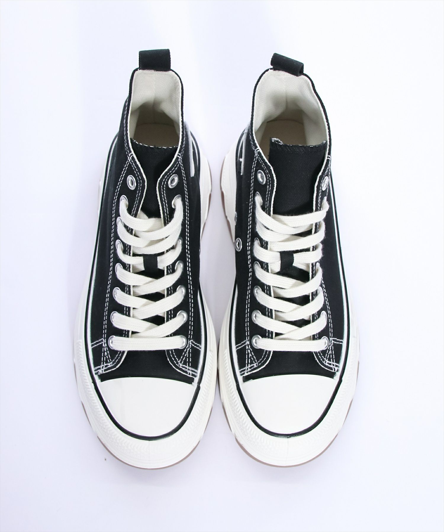 カジュアルコーデには必須!キャンバス地ハイカットスニーカー。程よい厚底のボリューム感がスタイルアップします!どんなコーディネートにも合わせやすいので、大活躍間違いなしです◎*生産の工程上、アッパーやソールの接合部に接着剤の付着やはみだしが見られる場合がございますが、特性としてご了承くださいませ。