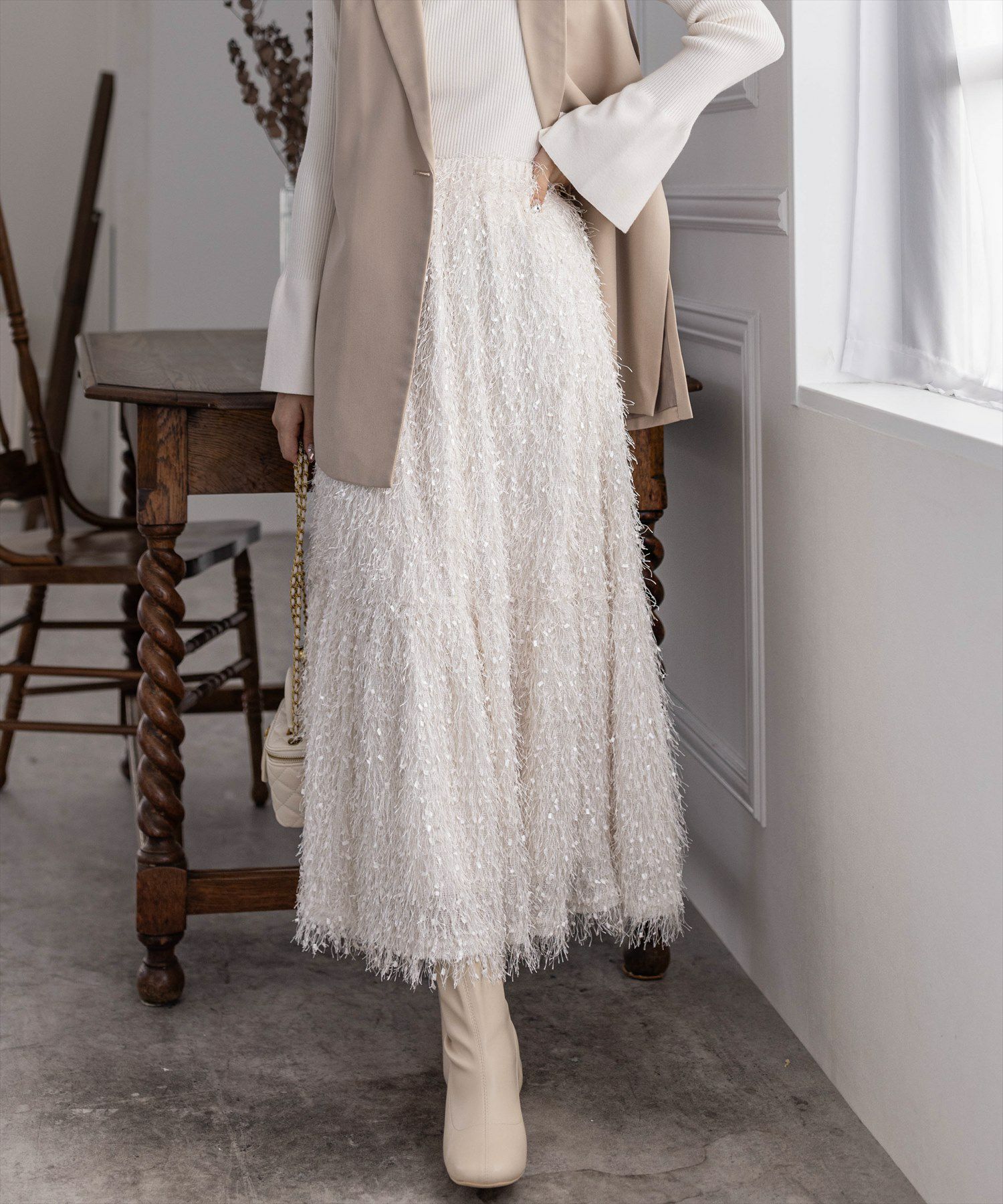 コーデの主役になる!フリンジフレアスカート【デザイン】トレンド感のあるフリンジ素材のフレアスカートです。ボリューム感のある裾幅で高見え効果抜群です!ウエストはゴムなので楽にご着用いただけます♪【コーディネート】きれいめなトップス合わせでオケージョンでもご着用いただけます♪オーバーサイズのトップス合わせで大人なカジュアルにも◎