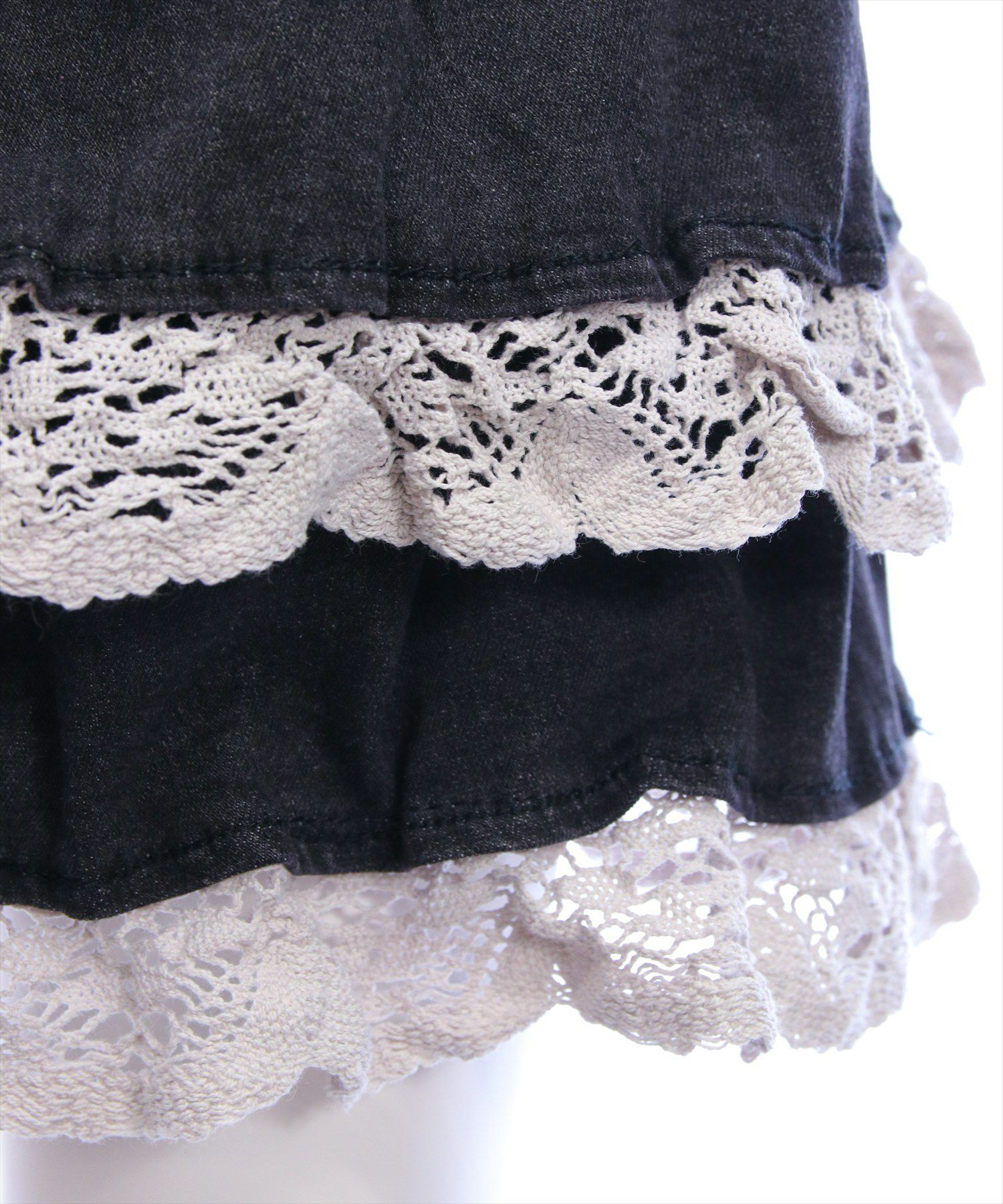 デニムのカジュアルさに、レースのティアードを組み合わせた個性派スカート。段差のある切り替えが立体感を生み、シンプルなトップスを合わせるだけで着映えするデザインです。ふんわり広がるティアードシルエットが、脚をすっきりと見せてくれるのも嬉しいポイント◎