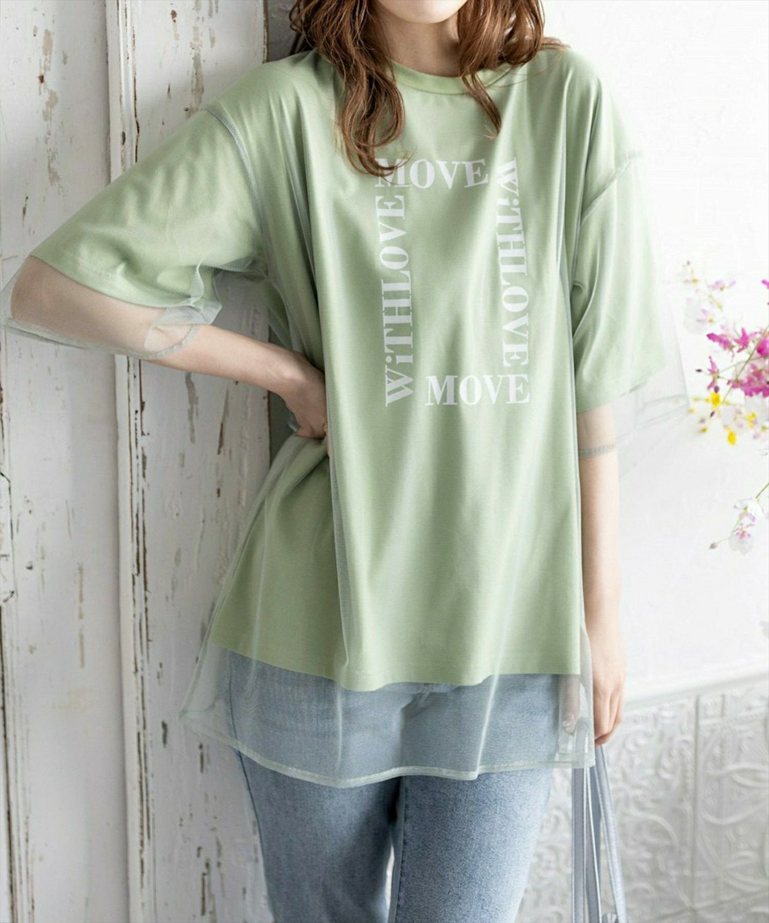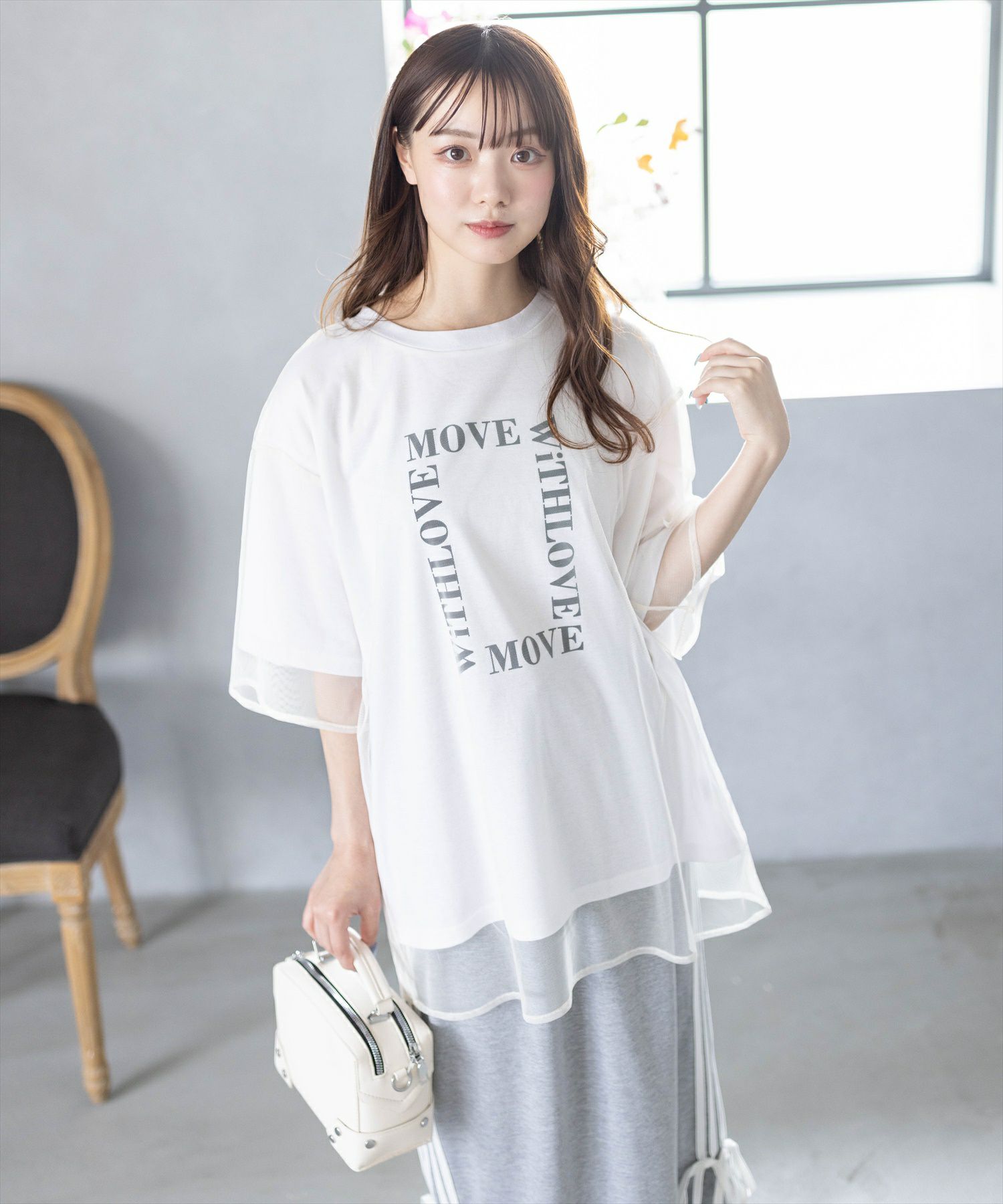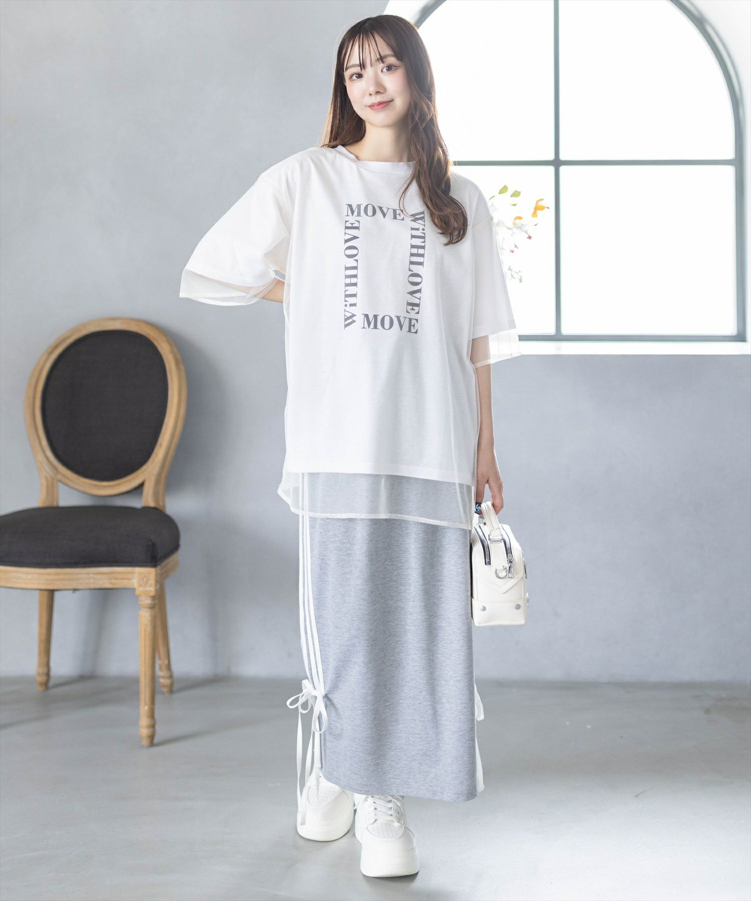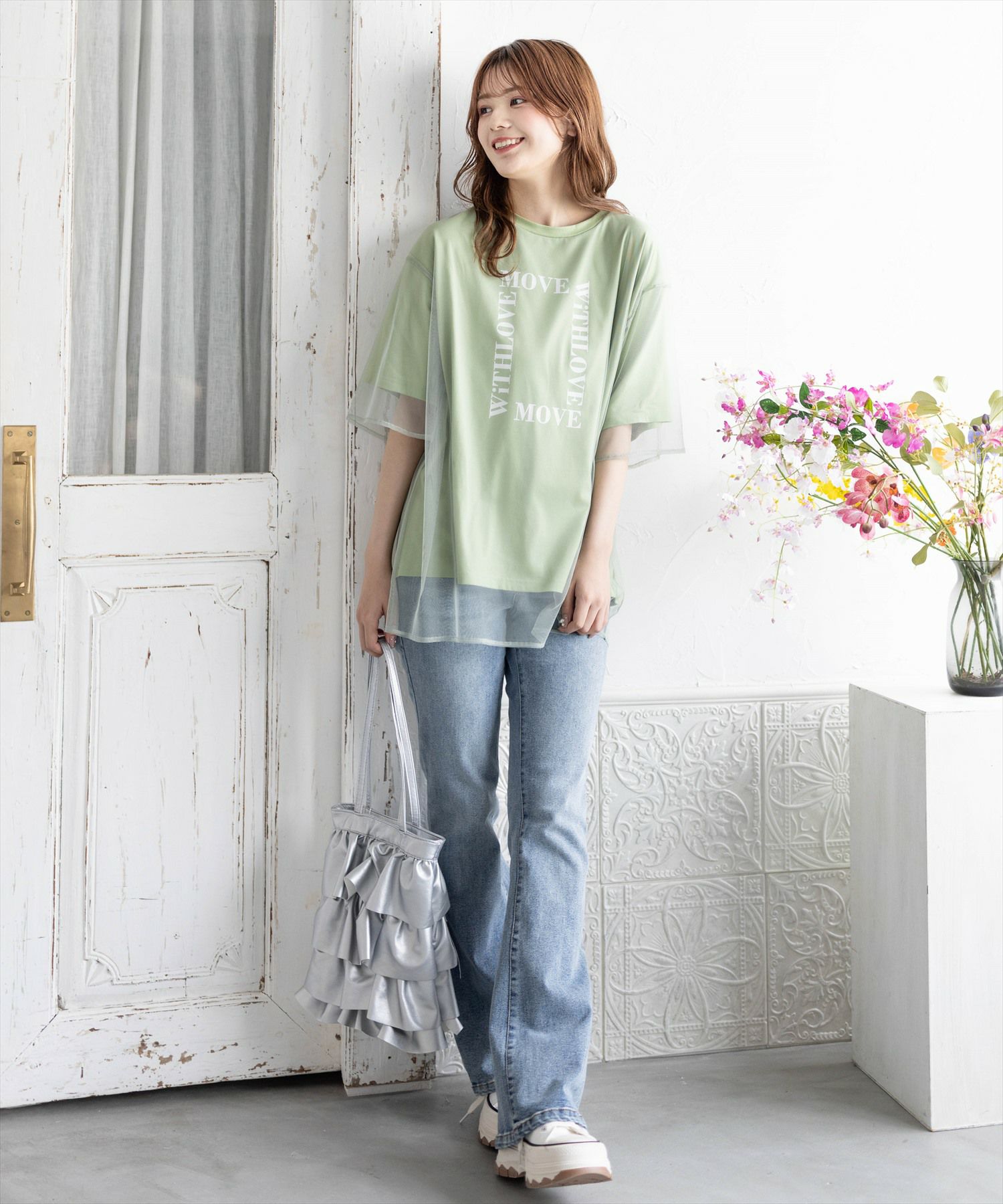 サイズ感が可愛い!チュールレイヤード半袖ロゴTシャツ【デザイン】チュールがレイヤードされているトレンド感のあるTシャツです。着丈や袖丈が長めなので体型カバーが叶います♪存在感のある大きいロゴも目を引くポイントです!【コーディネート】デニムパンツとの相性抜群で、カジュアルなコーデに仕上がります!すっきりと着用したい方はインしていただくのもオススメです◎