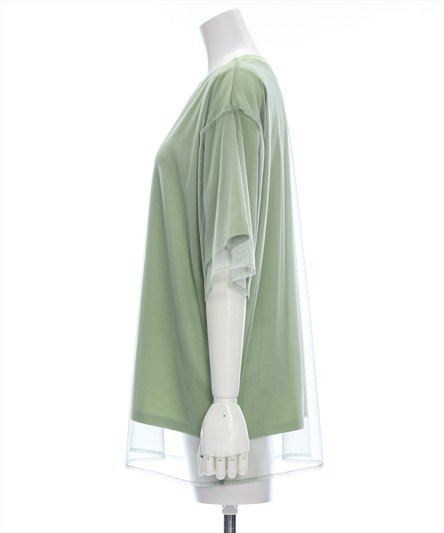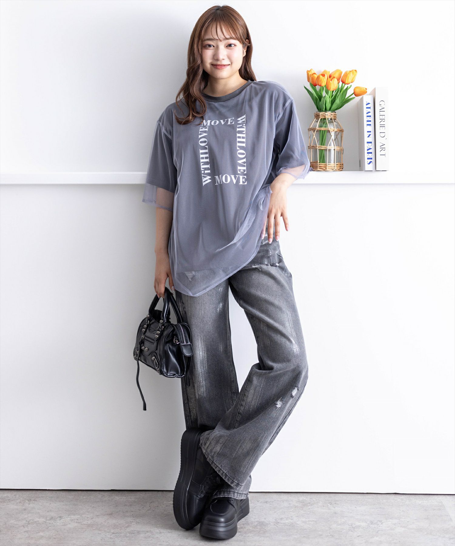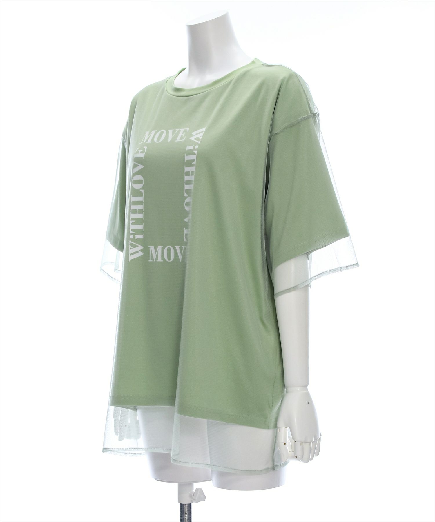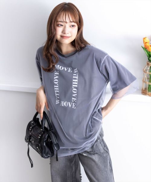 サイズ感が可愛い!チュールレイヤード半袖ロゴTシャツ【デザイン】チュールがレイヤードされているトレンド感のあるTシャツです。着丈や袖丈が長めなので体型カバーが叶います♪存在感のある大きいロゴも目を引くポイントです!【コーディネート】デニムパンツとの相性抜群で、カジュアルなコーデに仕上がります!すっきりと着用したい方はインしていただくのもオススメです◎