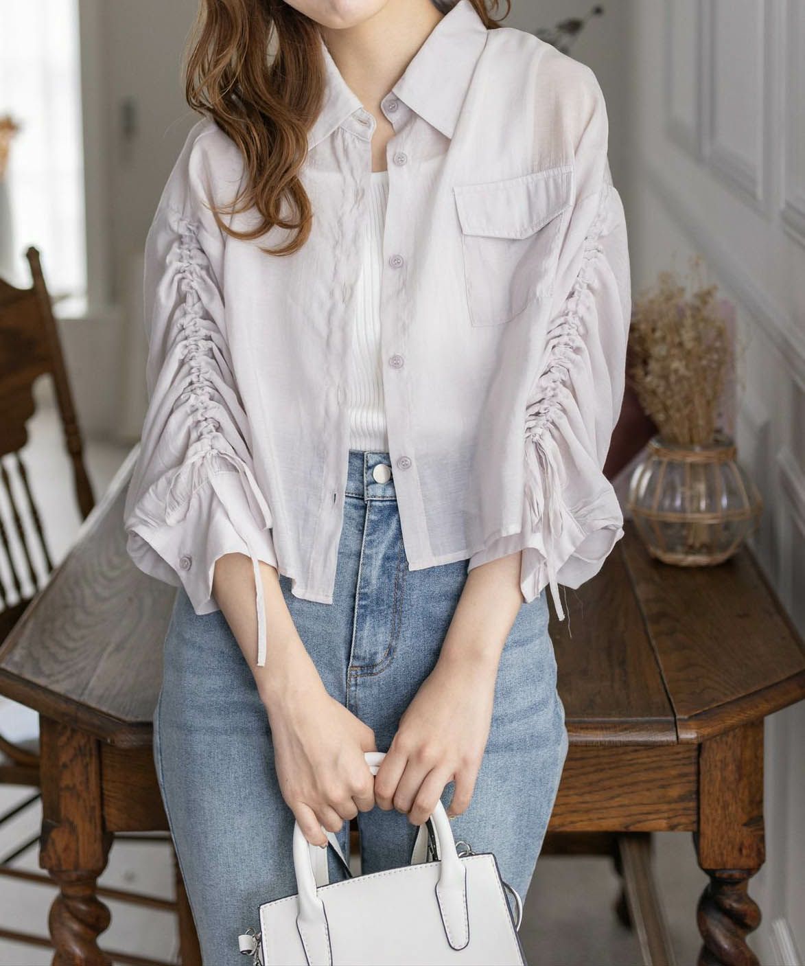ロングシーズンご着用いただける!袖シャーリングショートシャツ【デザイン】トレンド感のある袖シャーリングがポイントのシアーシャツです。シャーリングで袖丈を調節できるので、長くご着用いただけます♪シアー感のある生地でヘルシーな肌見せが叶います!【コーディネート】インナーとのレイヤードコーデをお楽しみいただけます!ワンピースの羽織りとしてもご着用いただけます◎