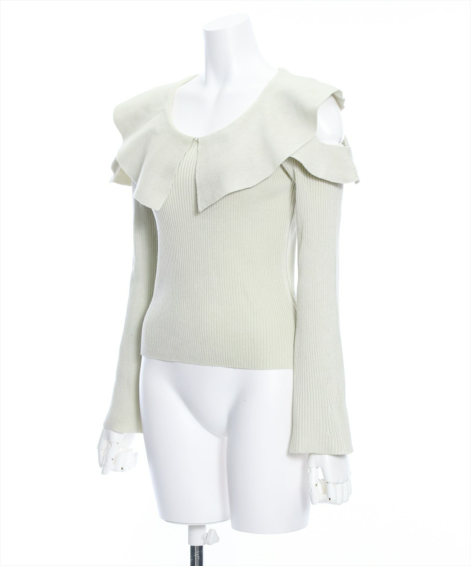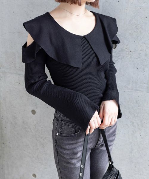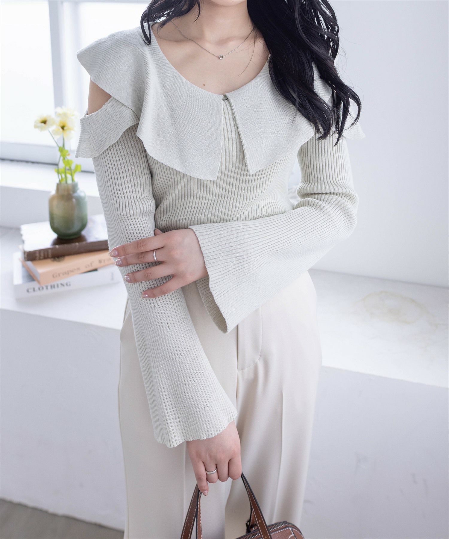 上品な印象に♪肩開きビックカラー長袖ニットトップス【デザイン】ビックカラーが特徴的で華奢見えが叶います♪袖部分少し空いているので、ヘルシーな肌見せで抜け感を出していただけます!きれいめなコーディネートに合うのでこれからの季節にぴったりのアイテムです!【コーディネート】マーメイドスカートやフレアスカートなど、エレガントなアイテムと合わせで大人上品に着こなしていただくのが◎