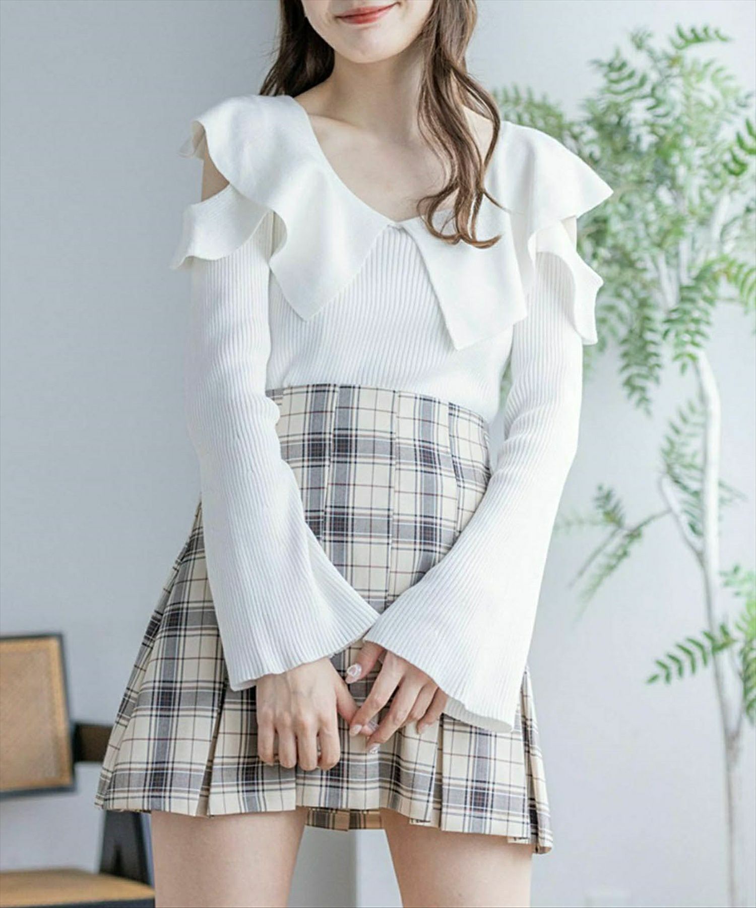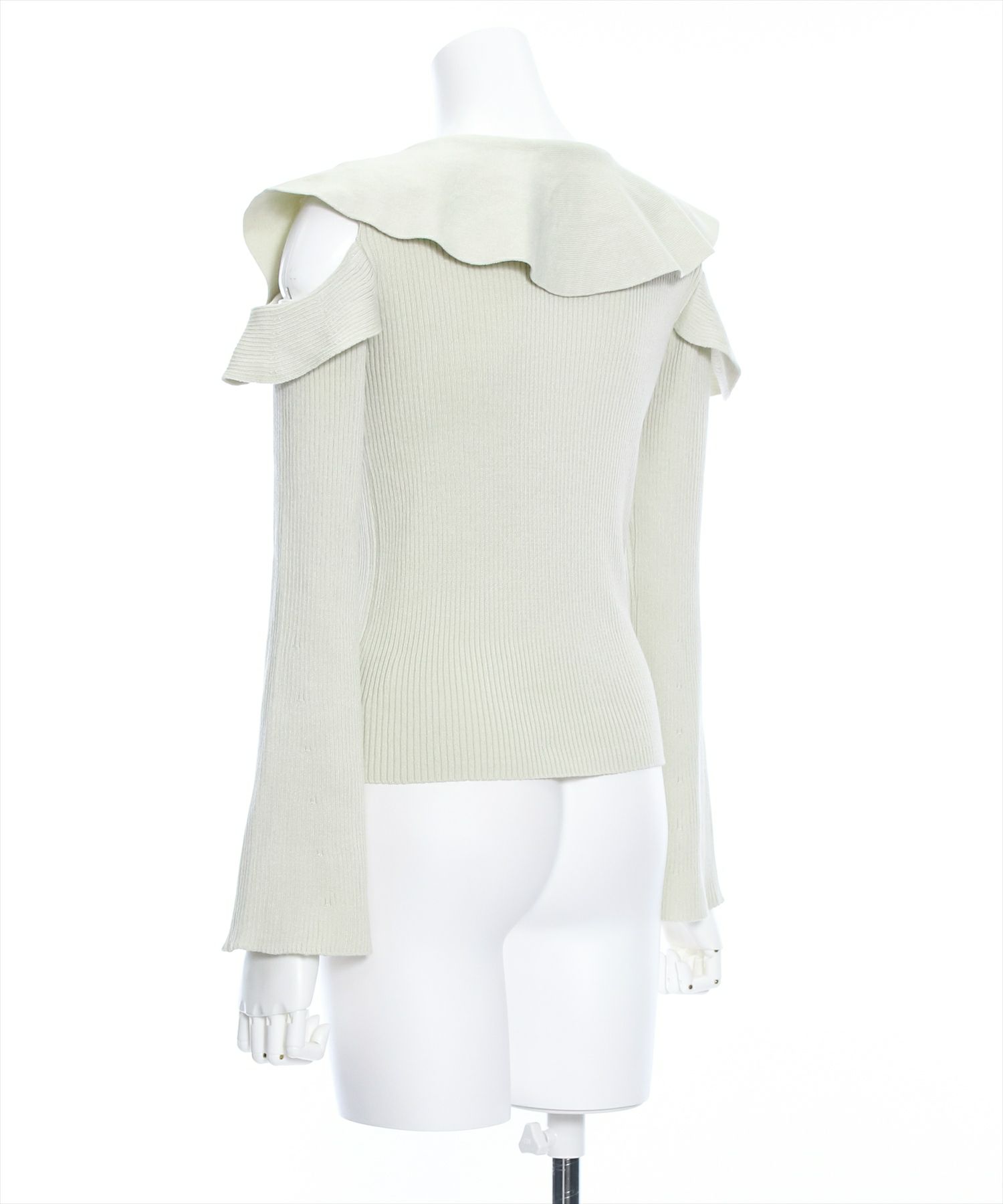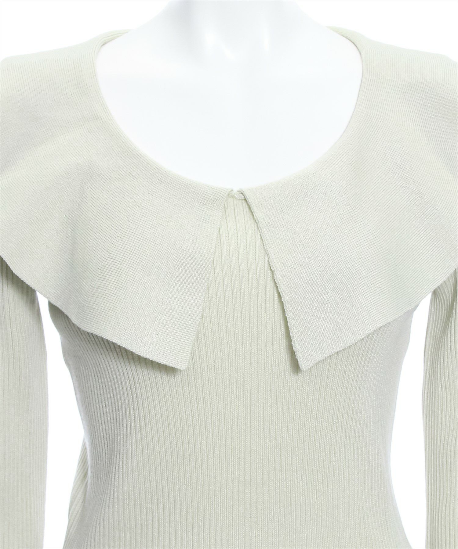 上品な印象に♪肩開きビックカラー長袖ニットトップス【デザイン】ビックカラーが特徴的で華奢見えが叶います♪袖部分少し空いているので、ヘルシーな肌見せで抜け感を出していただけます!きれいめなコーディネートに合うのでこれからの季節にぴったりのアイテムです!【コーディネート】マーメイドスカートやフレアスカートなど、エレガントなアイテムと合わせで大人上品に着こなしていただくのが◎