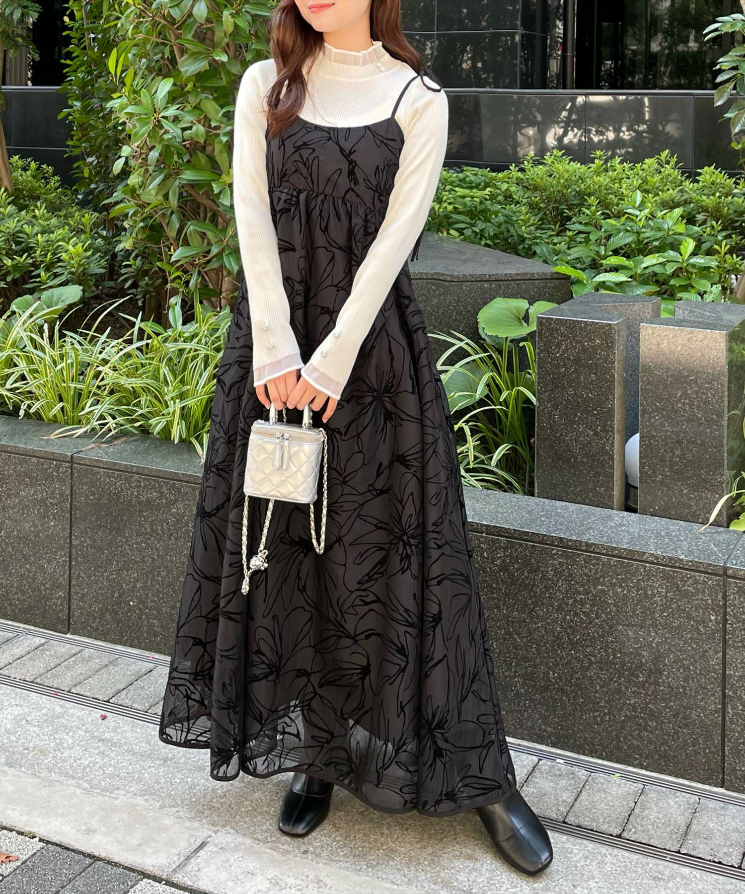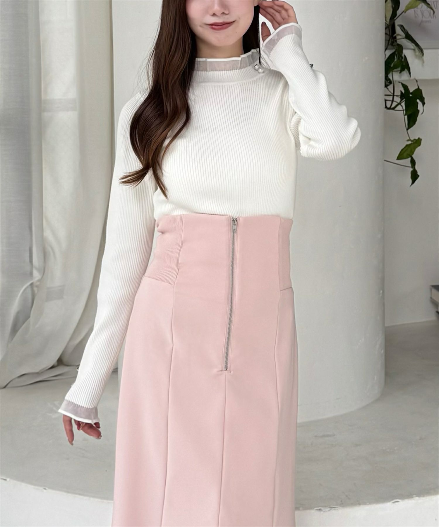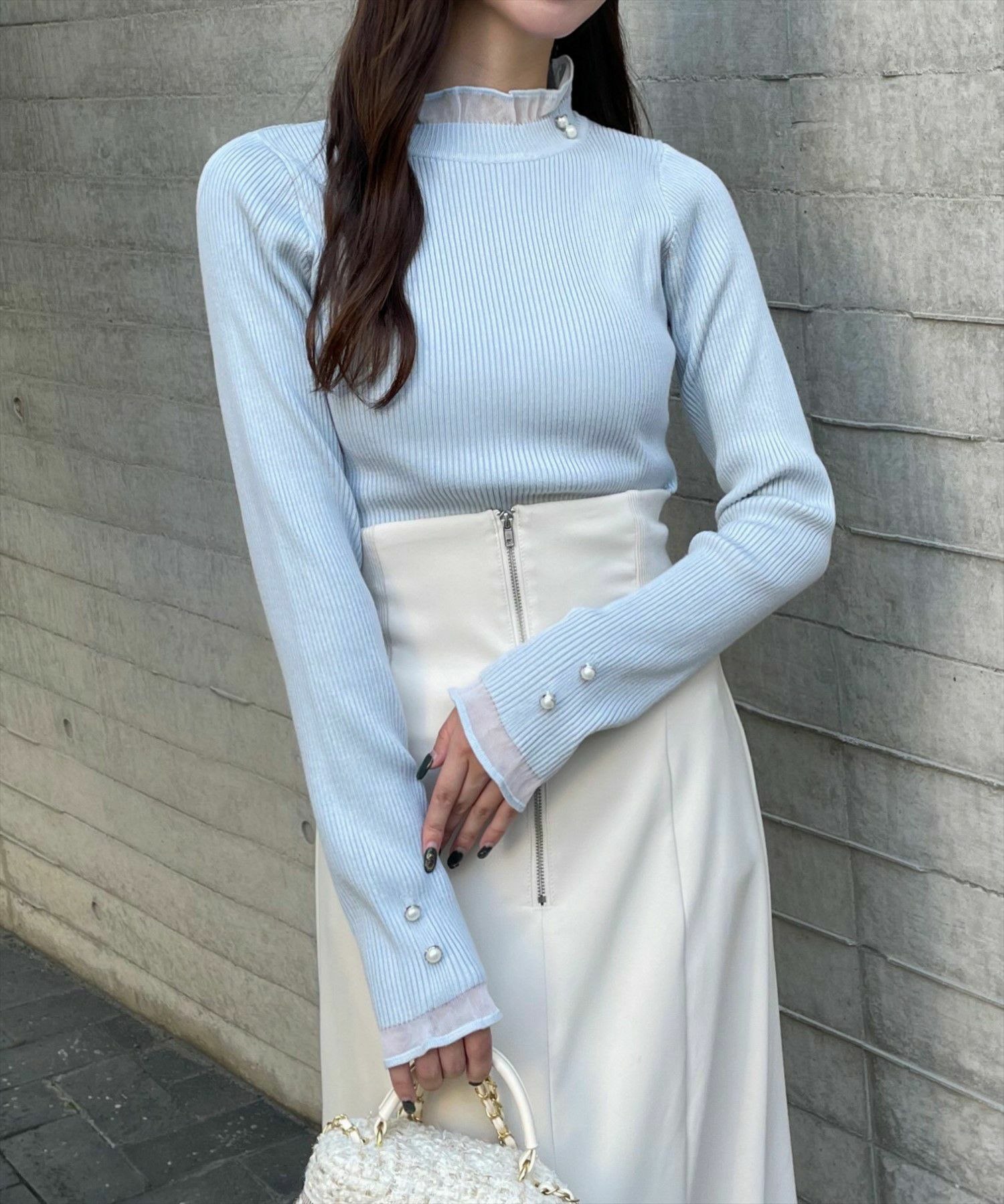 透け感やボタンが可愛い!シアーフリルネック長袖ニットトップス【デザイン】首元と袖にシアー感のある素材がドッキングされているニットトップスです。さらにビジューボタンも可愛いポイントです♪一見シンプルに見えますが、デザイン性があるので1着でコーデが決まります!【コーディネート】タイトなシルエットなので、フレアスカートやミニスカート合わせでラインを綺麗に見せていただくのがオススメです!キャミワンピのインナーとしても◎