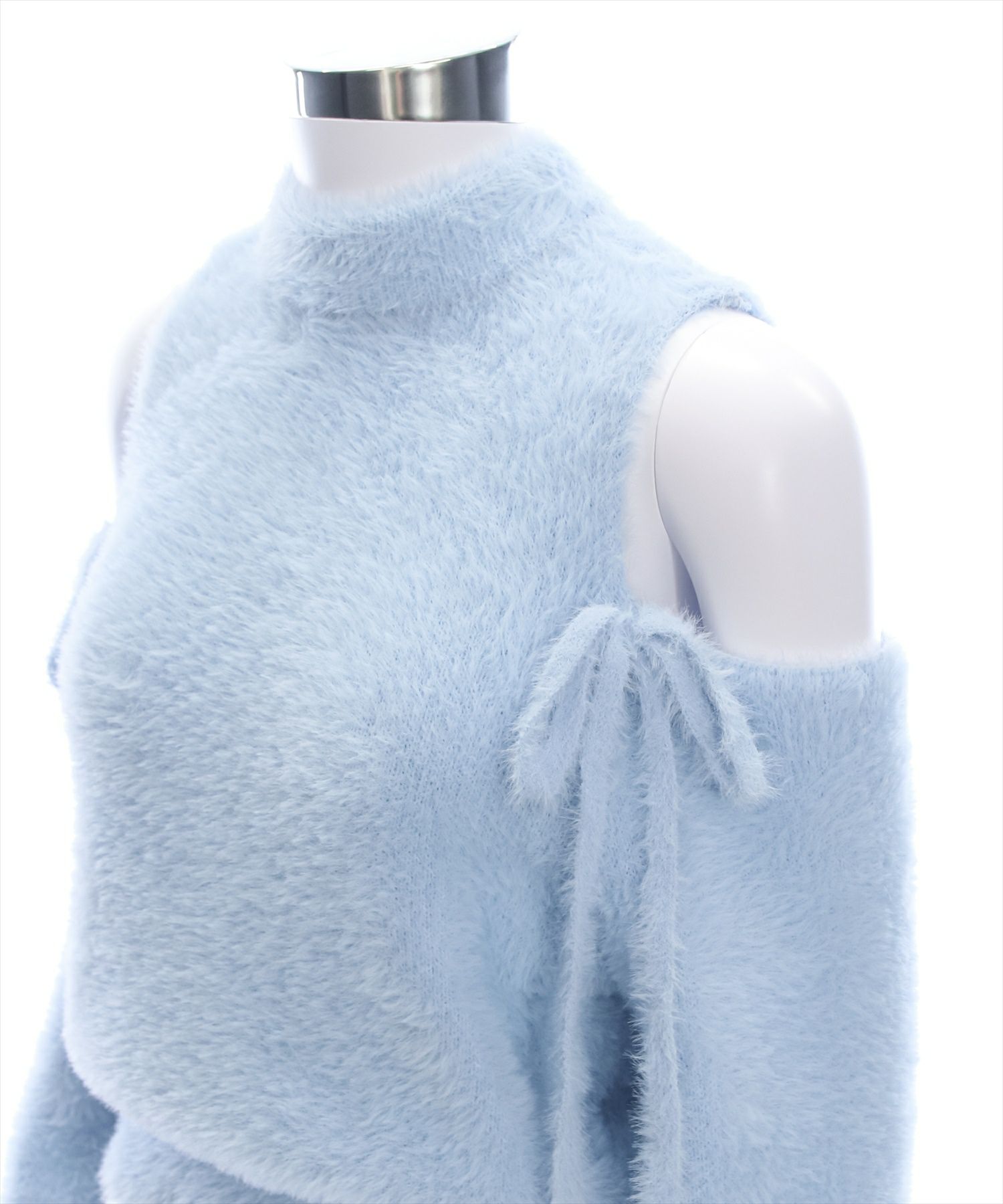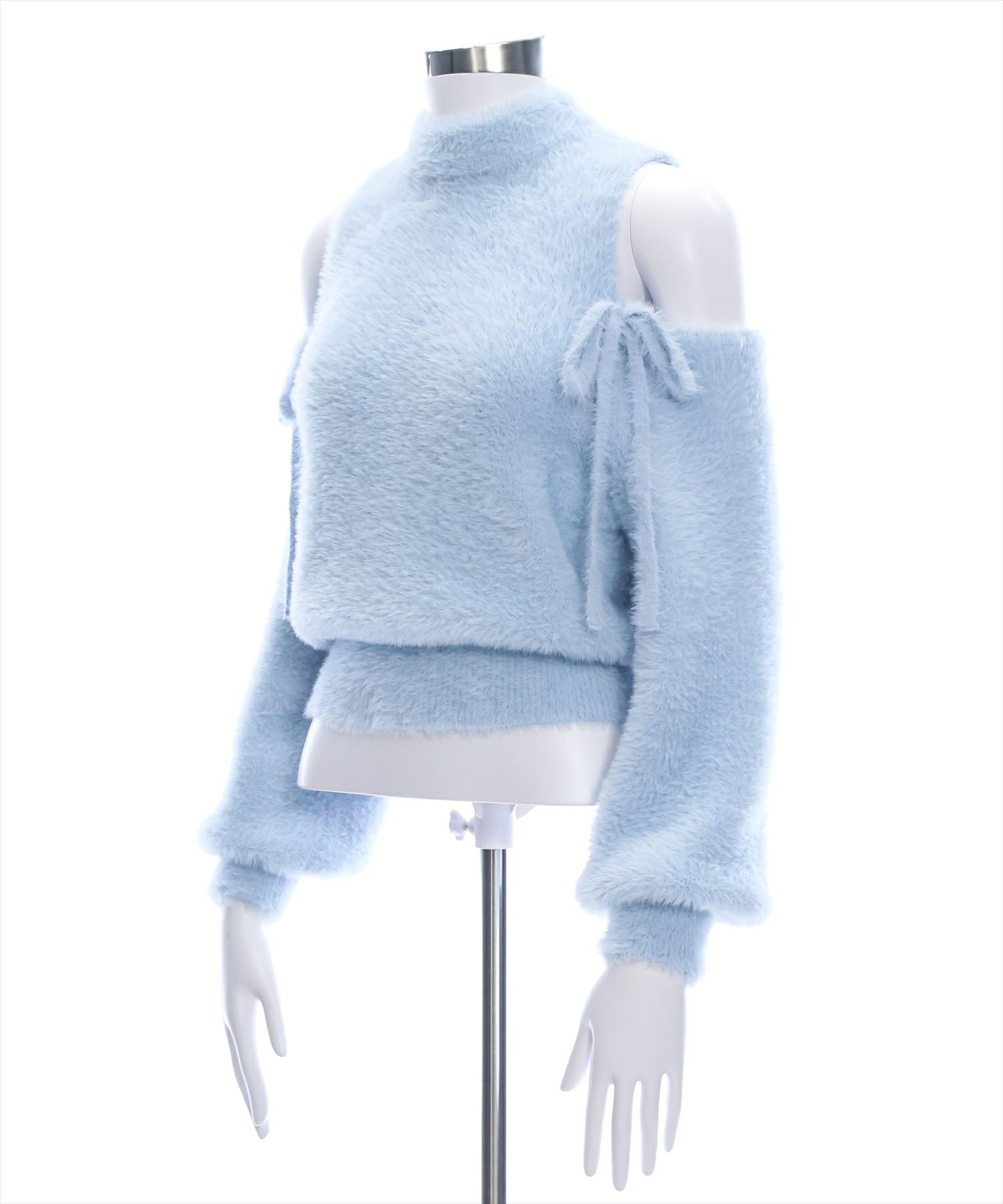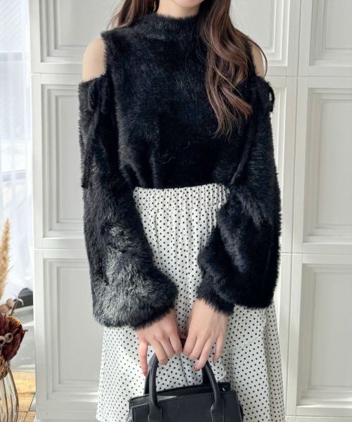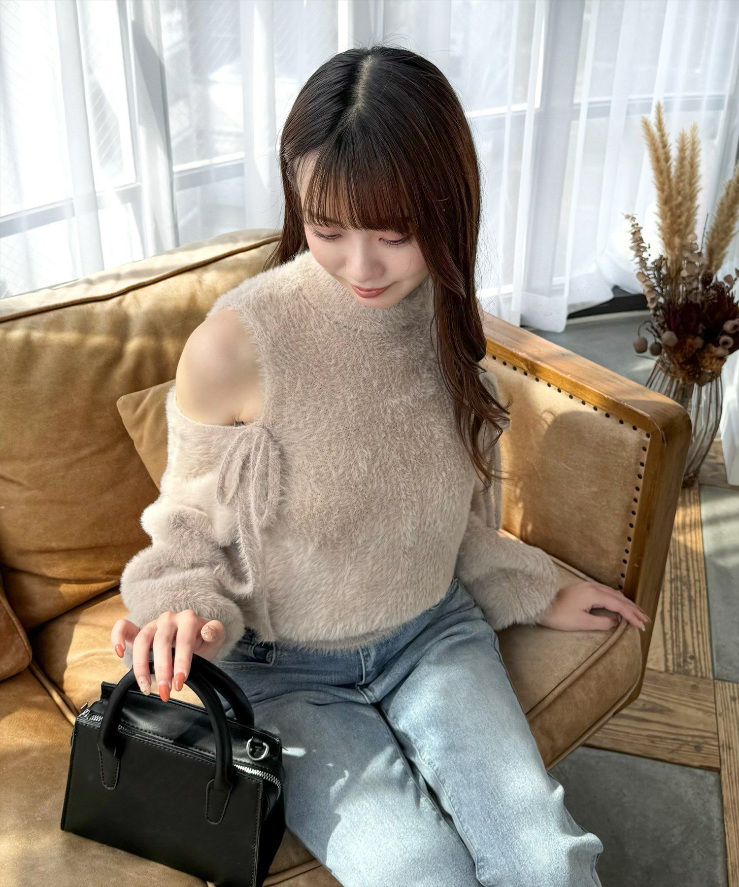 あざと可愛い!肩あきリボンフェザーニットトップス【デザイン】オープンショルダーでヘルシーな肌見せが叶うニットトップスです。肩部分にリボンがついていて、あざと可愛い印象になります♪フェザー素材でトレンド感のあるコーデが完成します!【コーディネート】ミニスカートやフレアスカート合わせで、女性らしいコーデがオススメです◎ハイウエストのボトムスとの相性抜群でスタイルアップが叶います!