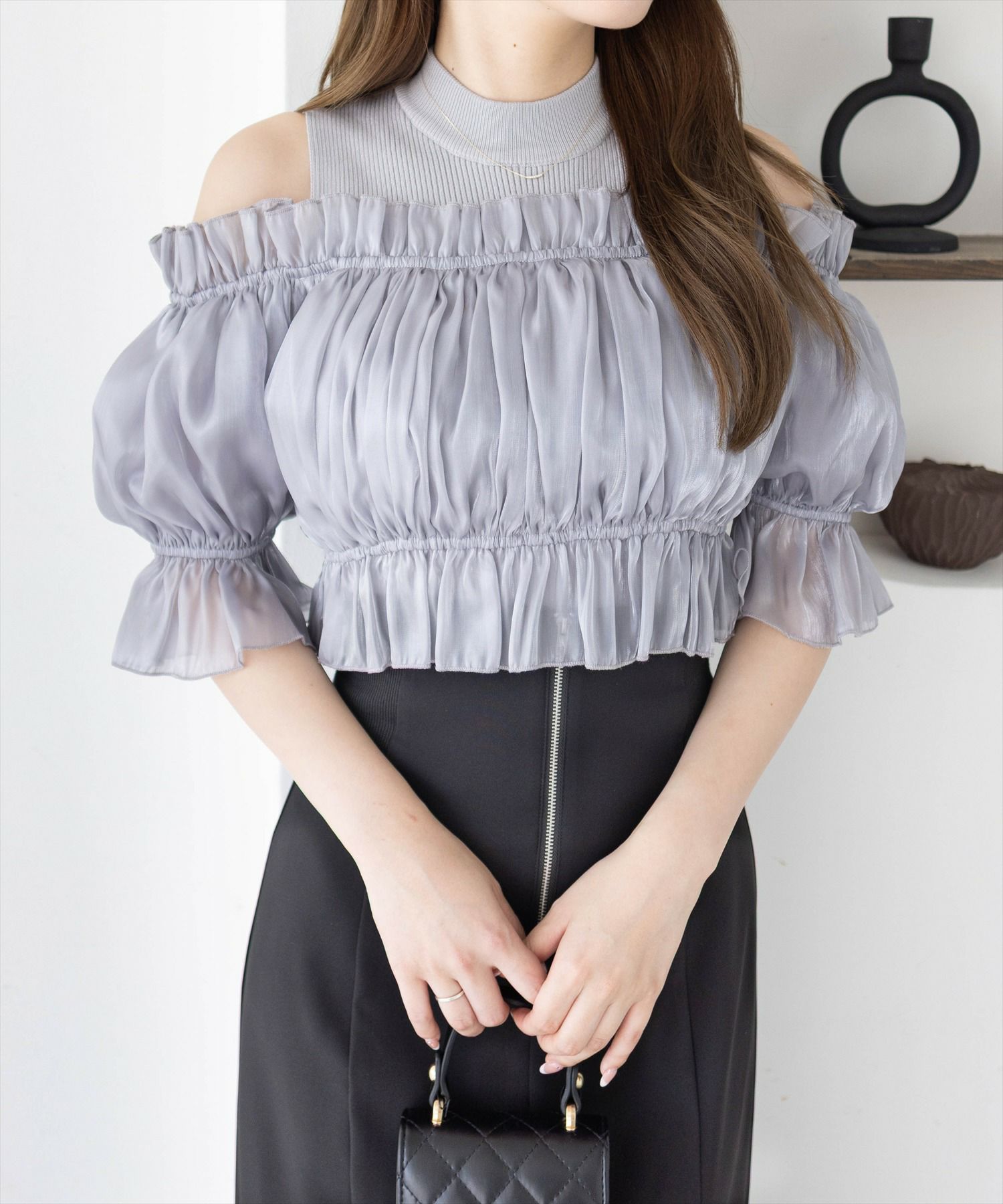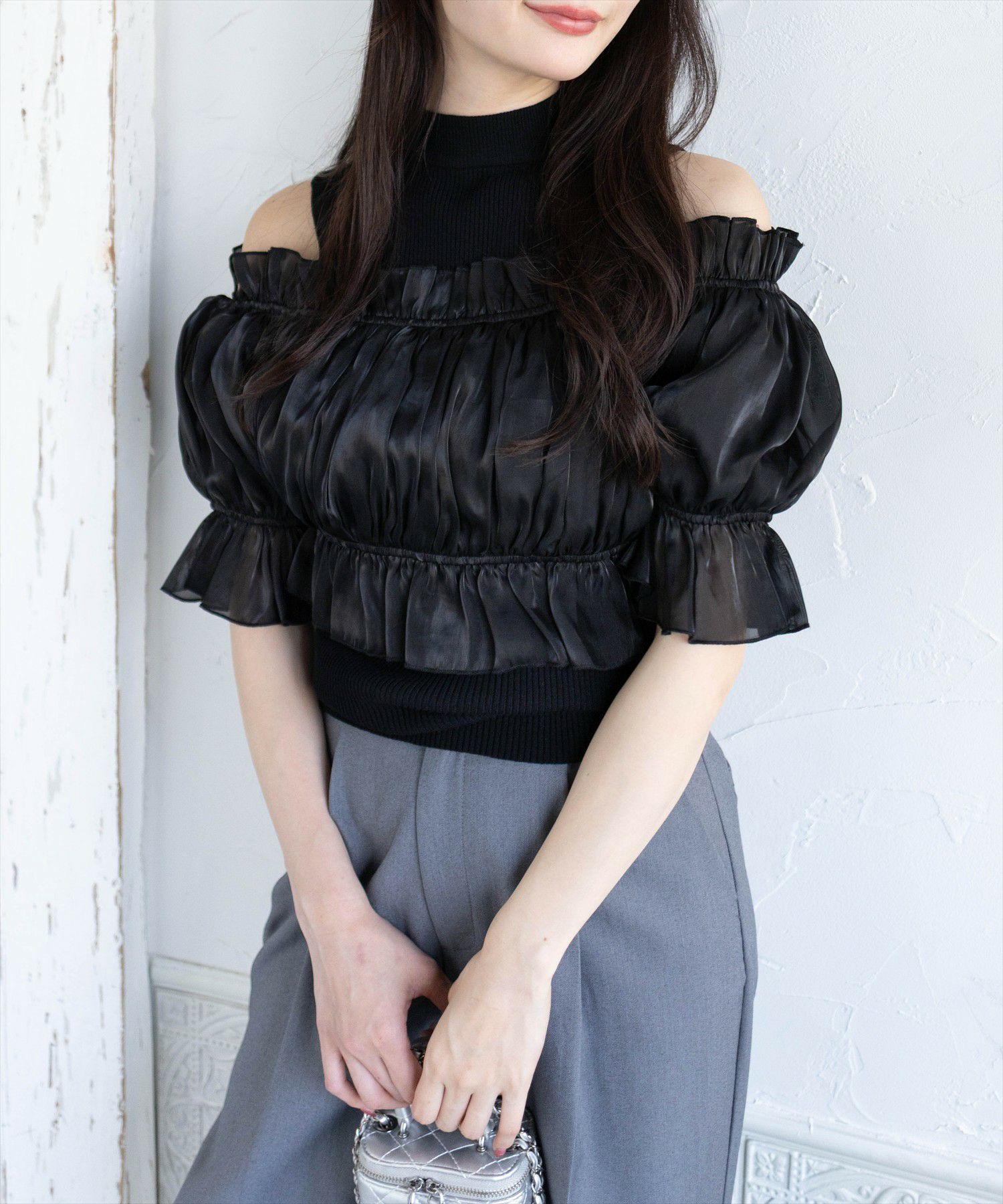 大人気間違いなし!布帛ドッキングオフショルニットトップス【デザイン】光沢感のある布帛がドッキングされ、高見えするニットトップスです。ボリューム感のあるデザインで、顔周りが華やかになります!さらに肩部分が少し見えるオフショル仕様なので、程よい肌見せが叶います♪【コーディネート】マーメイドスカートやフレアスカート合わせで上品なコーデが叶います!デニムパンツ合わせで甘さを抑えたコーデも◎