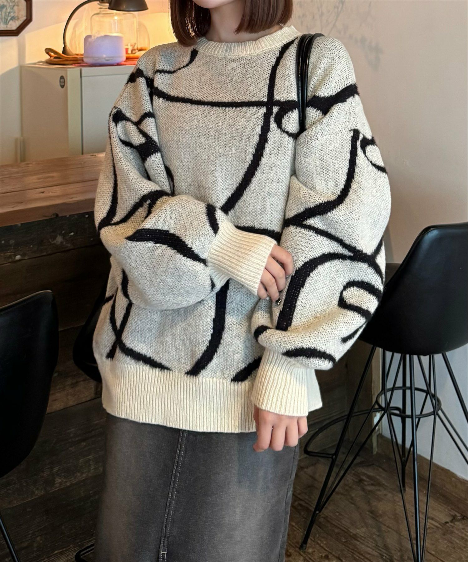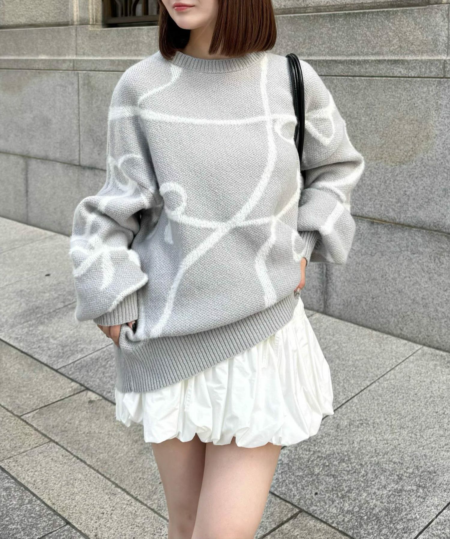 トレンドライクな!リボン柄ジャガードニットトップス 【デザイン】 トレンド感のあるリボン柄がほどこされたニットトップスです。ジャガード素材なので、高見え間違いなしです!着丈が長めなので、ゆったりとご着用いただけます♪ 【コーディネート】着丈が長めなので、ショートパンツ合わせでワンピース風にご着用いただけます♪チュールスカートやフレアスカート合わせでゆったりとしたコーデも