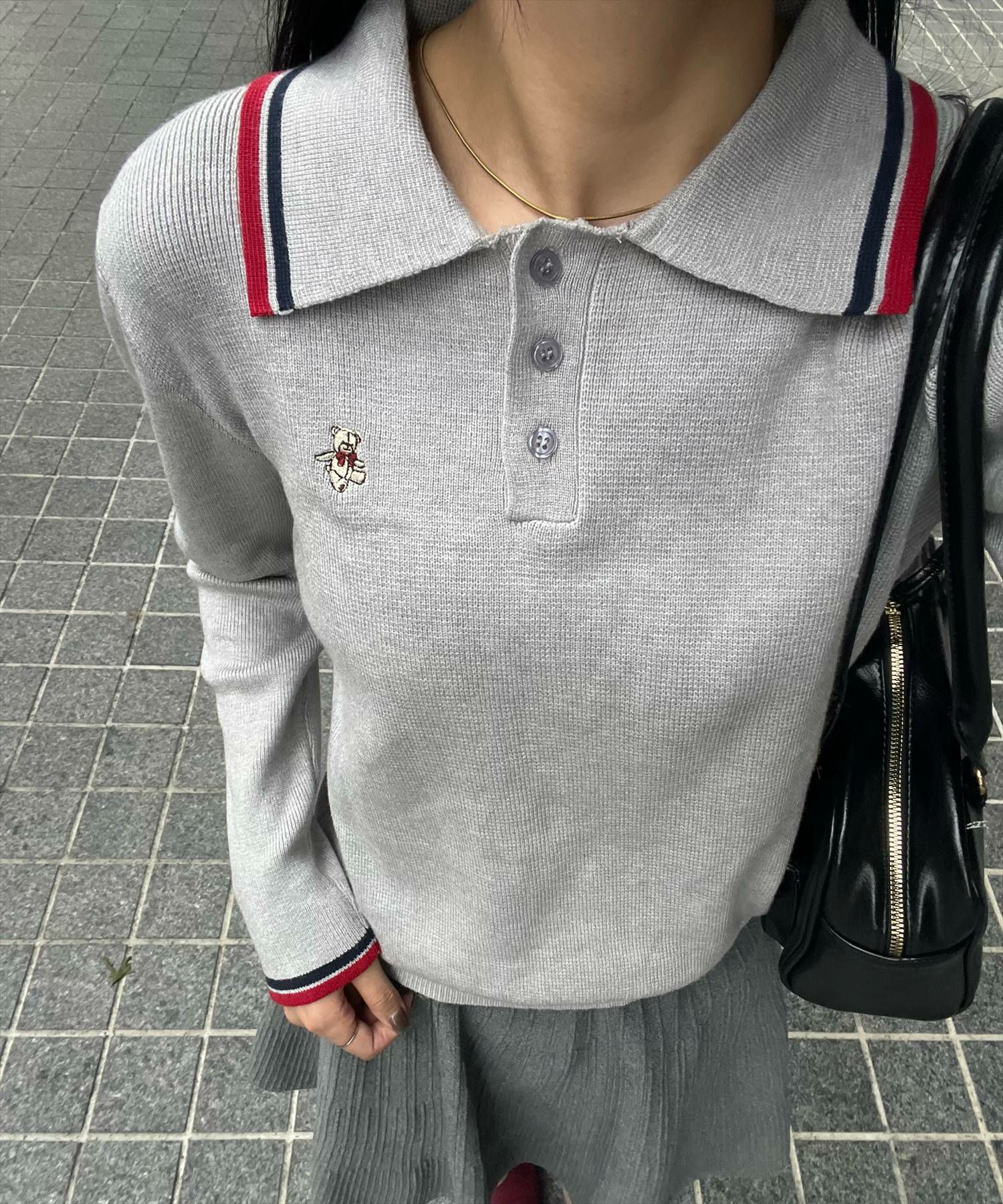 clear ベア刺繍入り長袖ポロニット[CL8574]