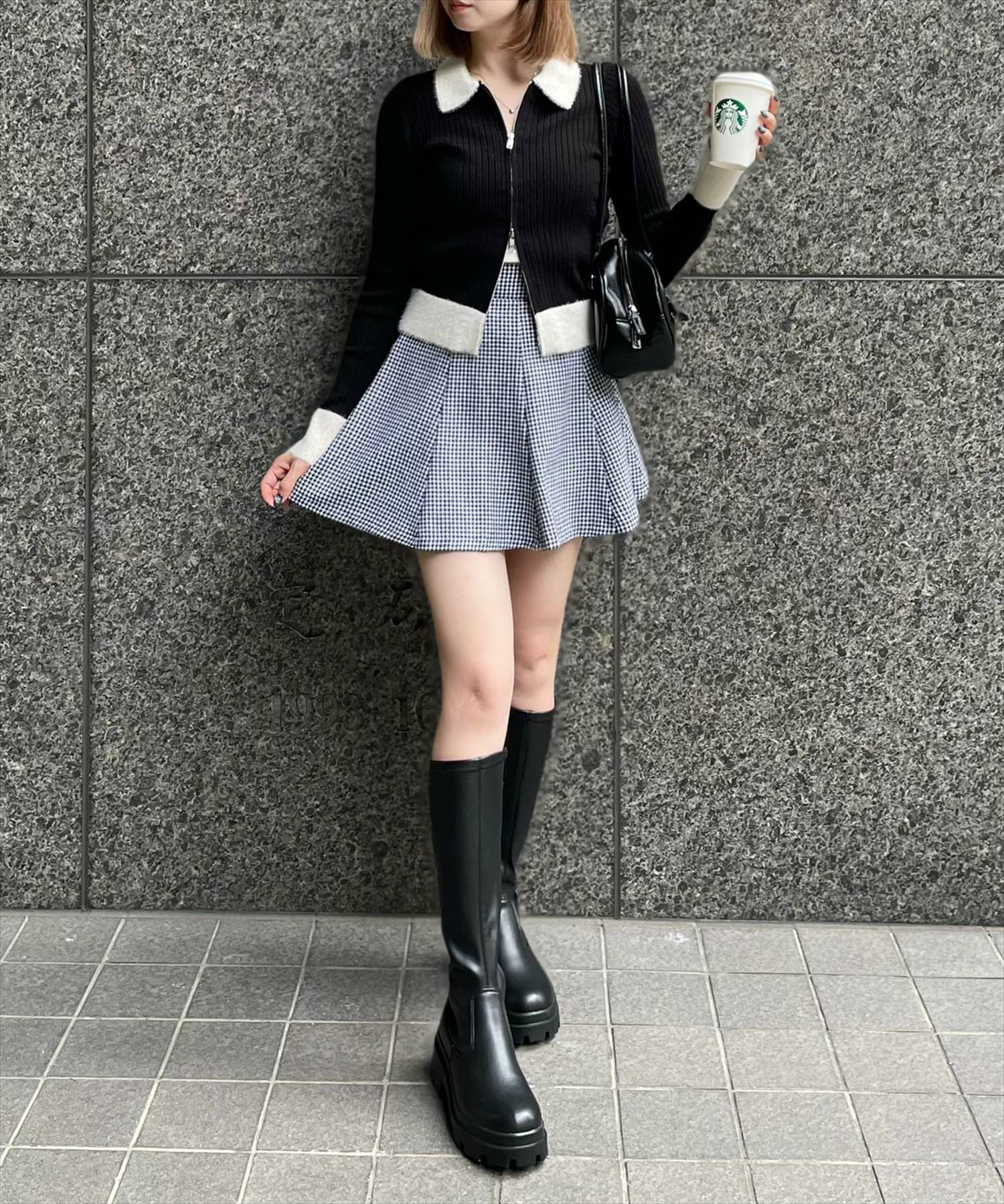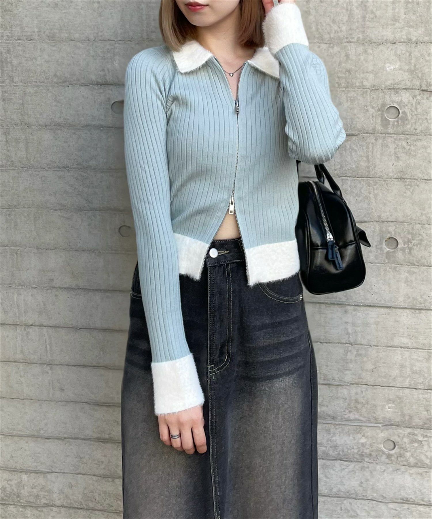 clear 襟袖ショートフェザーダブルジップリブニットトップス[CL8447]