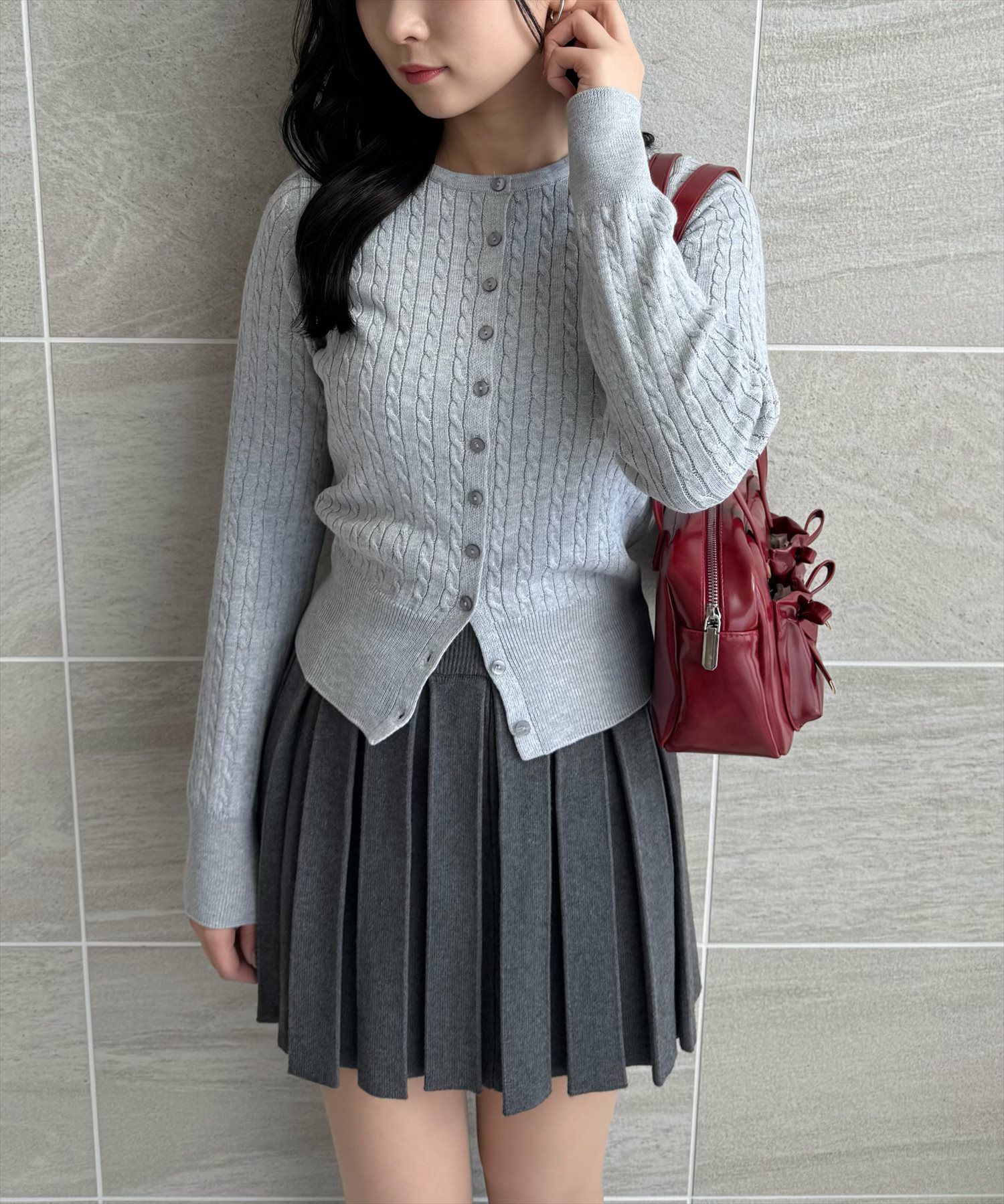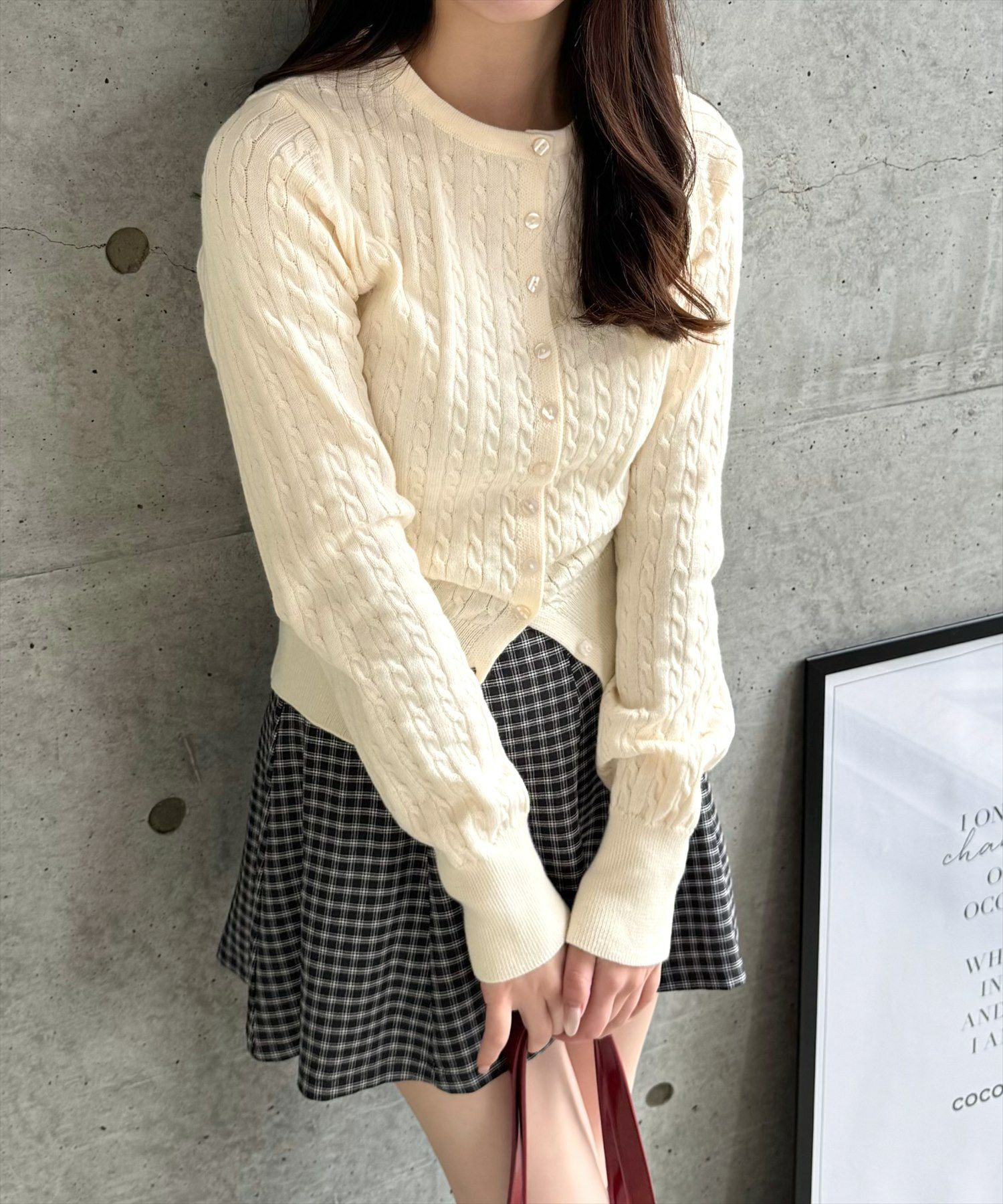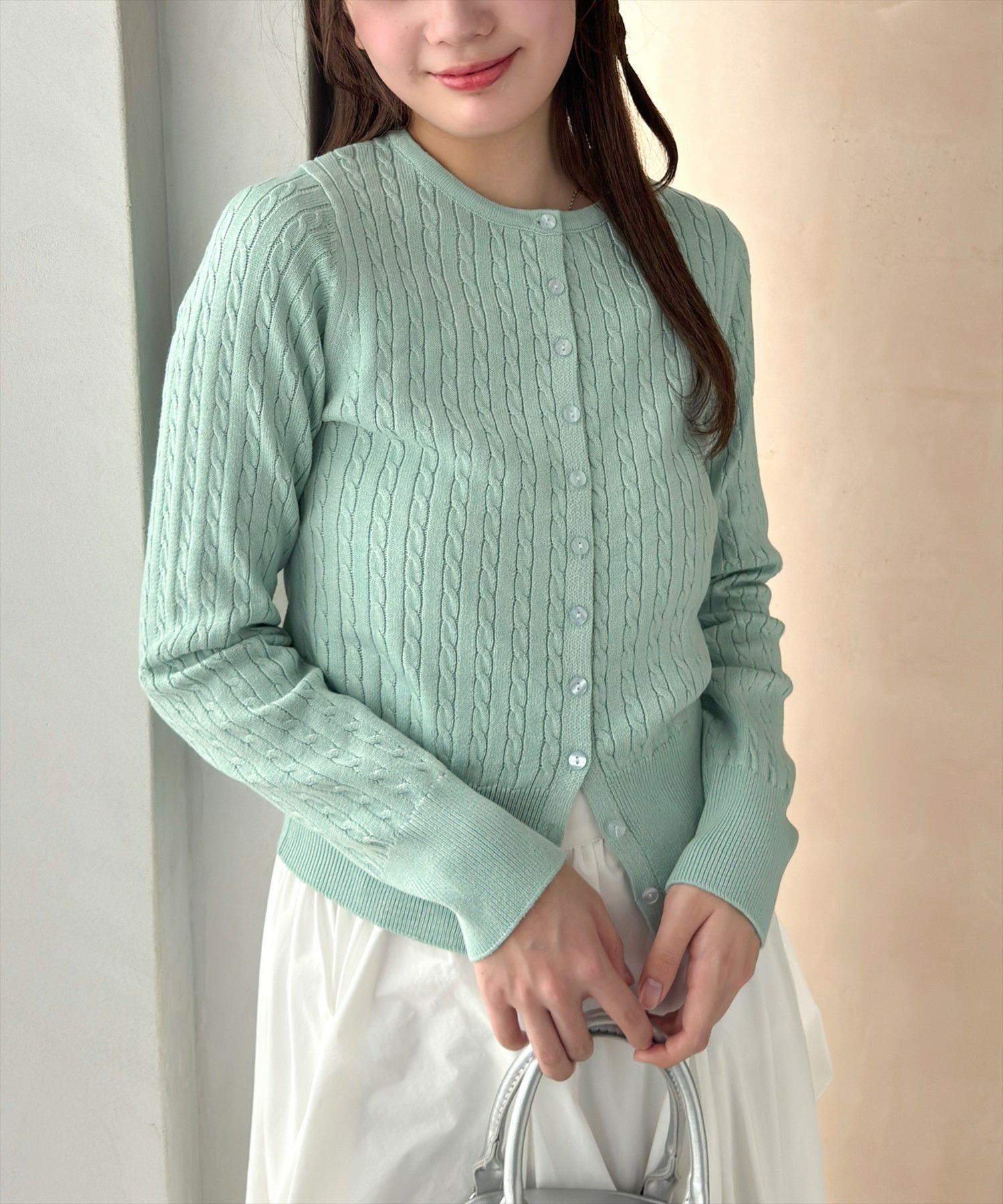 使い勝手の良い!ケーブル編みニットカーディガン【デザイン】ふんわりとした柔らかな印象が叶うケーブル編みカーディガンです。コンパクトなサイズ感で女性らしいシルエットが叶います♪ベーシックカラーから春らしいパステルカラーまで、カラー展開も豊富です!【コーディネート】カーディガンとしてはもちろん、トップス使いもしていただけます!シアーインナーやシャツとのレイヤードコーデもお楽しみいただけます◎