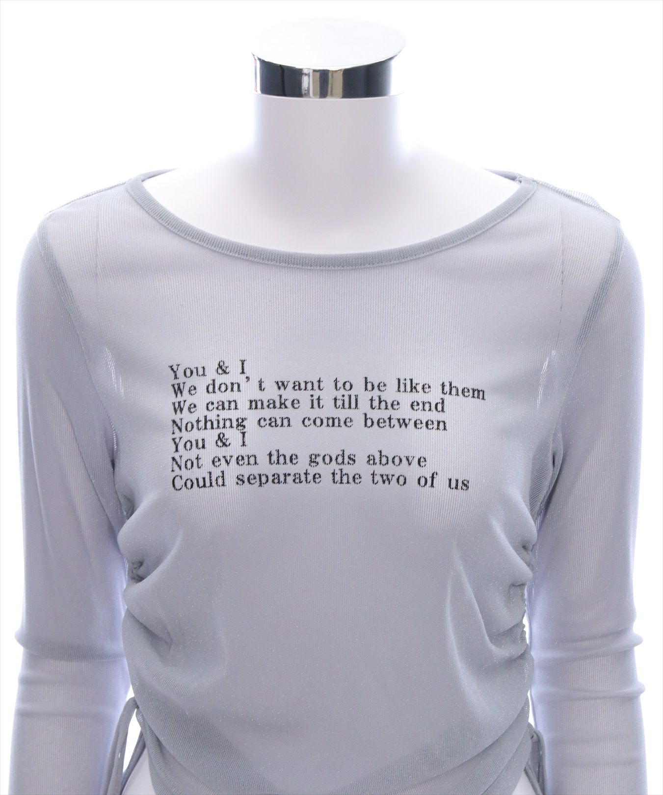 ラメ感のある生地が可愛いシアートップスです。フロントのロゴが目を引くポイントです!サイドにはドロストがほどこされているので、お好みで調整していただけます♪