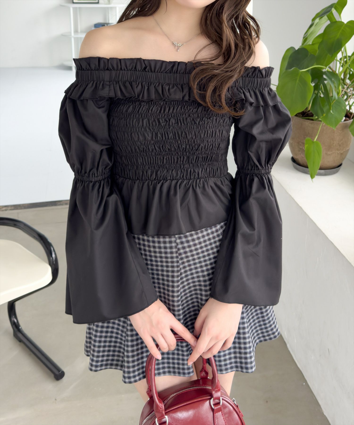 女の子らしい!フリルオフショルシャーリングブラウス【デザイン】オフショル仕様なので、ヘルシーな肌見せが叶うブラウスです。袖のふんわりとしたボリューム感も可愛いポイントです!胸元の細かいシャーリングもコーデのアクセントになります♪【コーディネート】程よいクロップド丈なので、どんなボトムスとも相性抜群です◎ハイウエストのボトムス合わせで、さらにスタイルアップが叶います♪