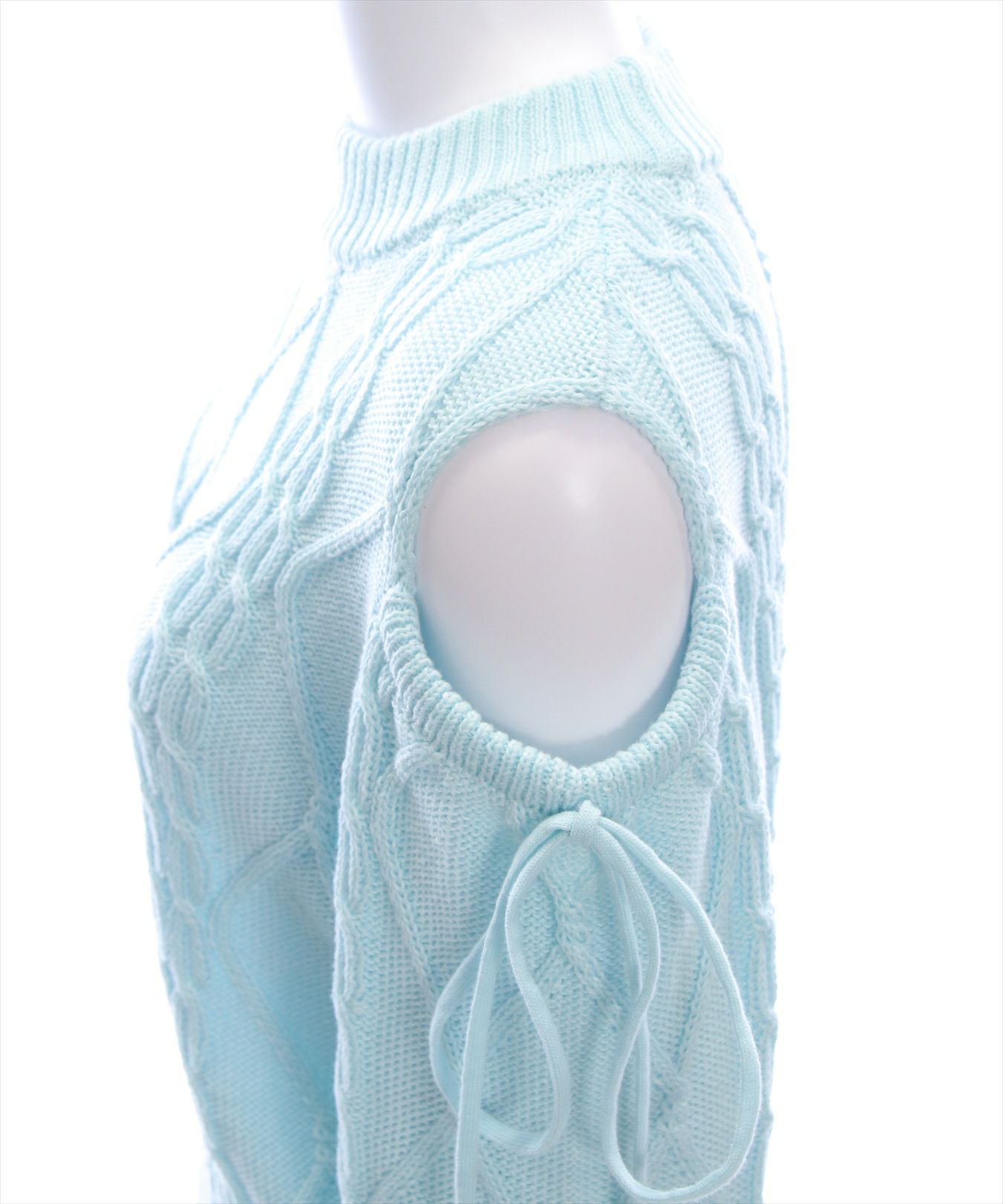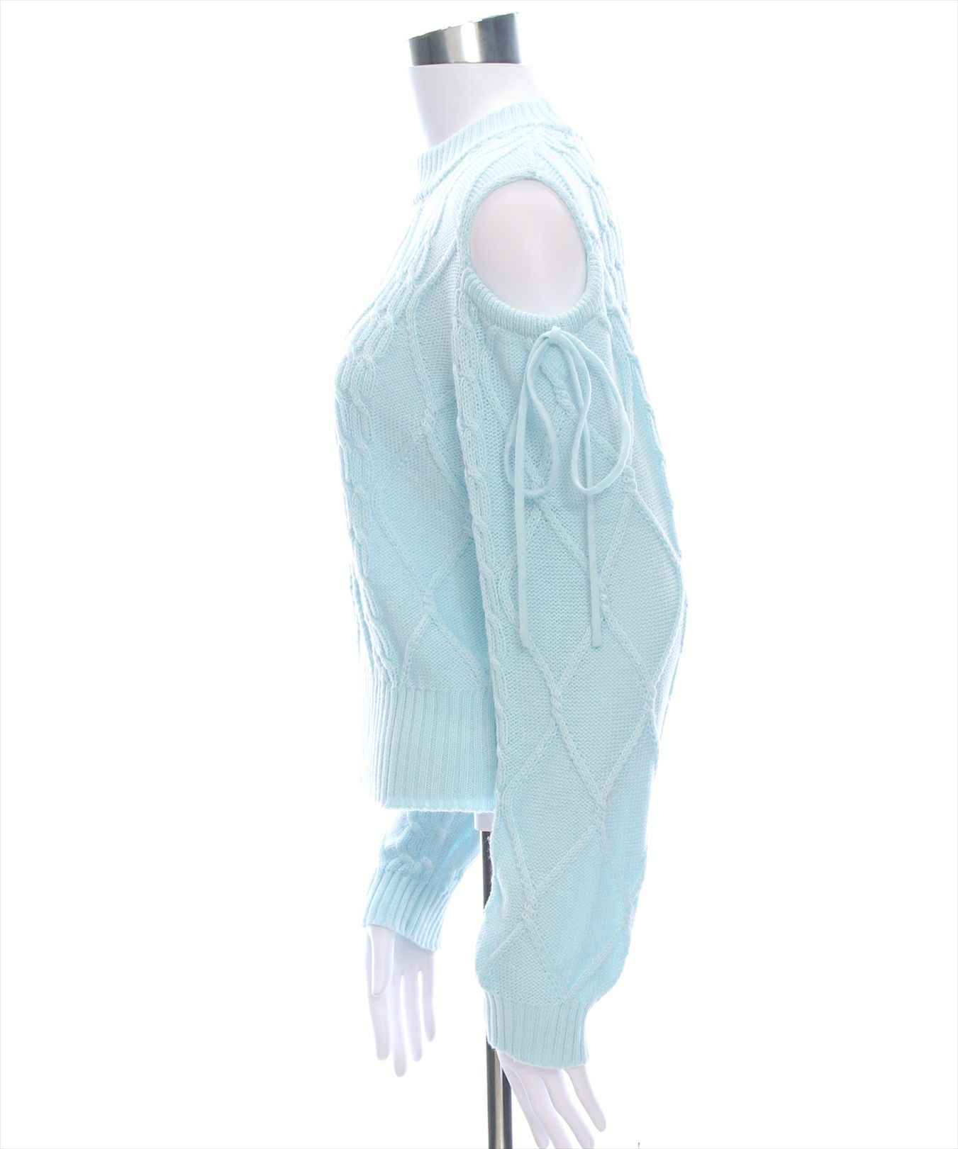 ケーブルの編み地にこだわったニットトップスです。さらにショルダー部分のリボンも可愛いポイントです!オープンショルダーなので、ヘルシーな肌見せが叶います♪