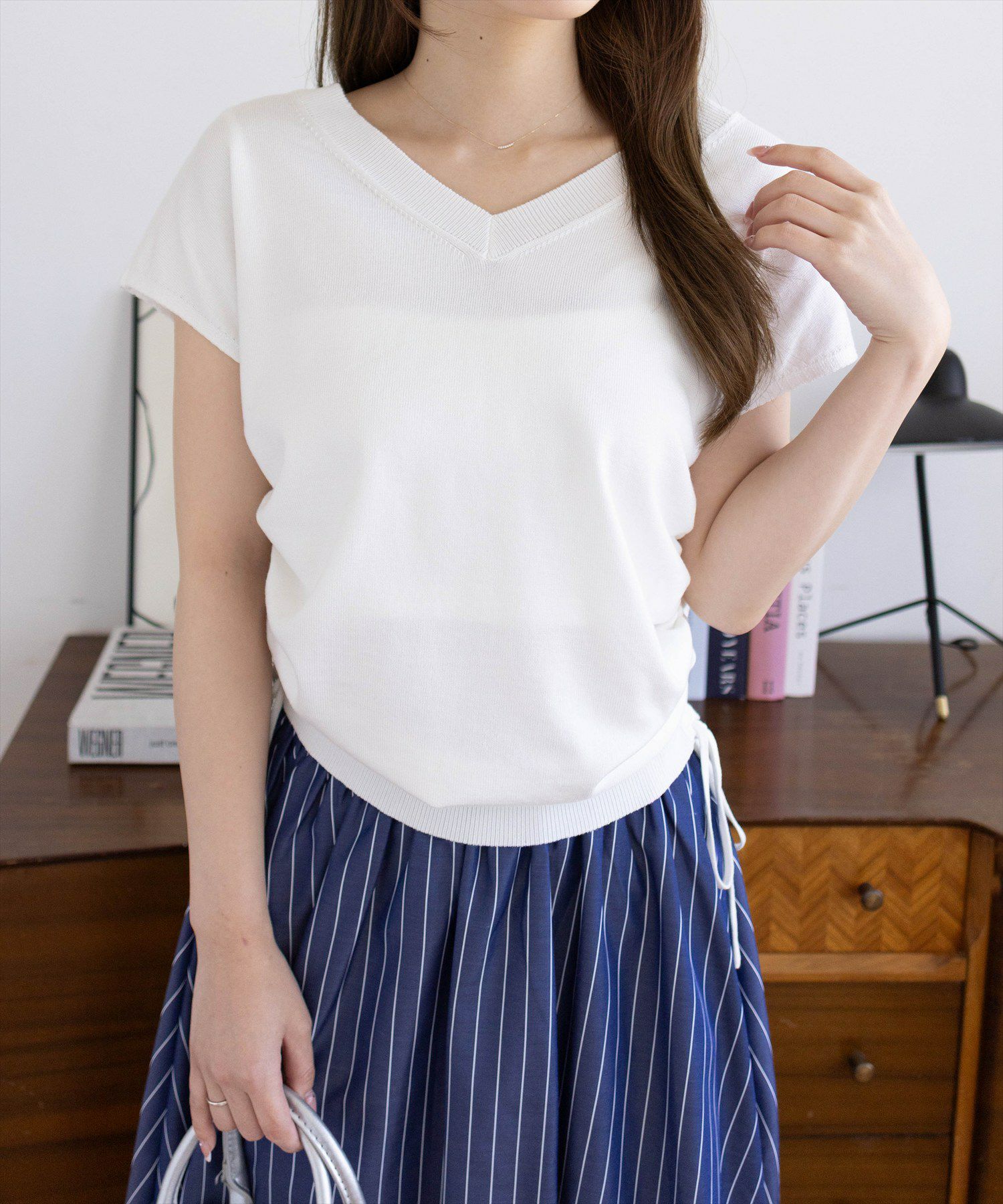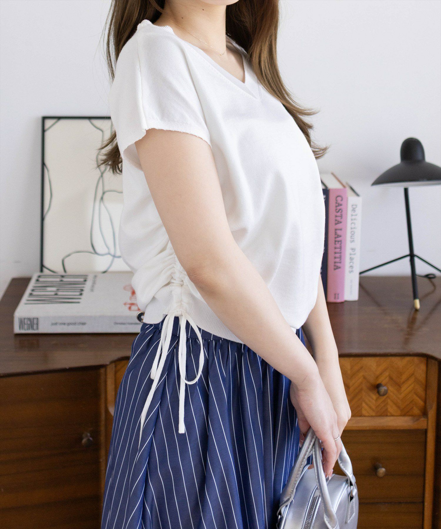 大人シンプル!2WAYフレンチスリーブサイドドロストニットトップス【デザイン】涼しく体型カバーが叶うニットトップスです。身体のラインを拾い過ぎないサイズ感でサイドのシャーリングがアクセントになっています!前後2way仕様なのでVネックとボートネック両方お楽しみいただけます。【コーディネート】シンプルなデザインなのでパンツ、スカートどちらのスタイルにも相性◎