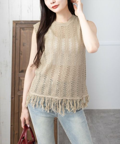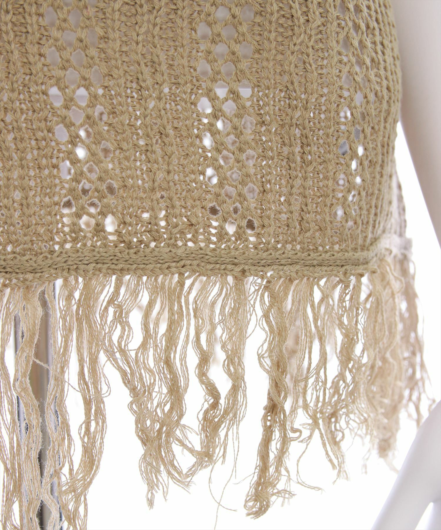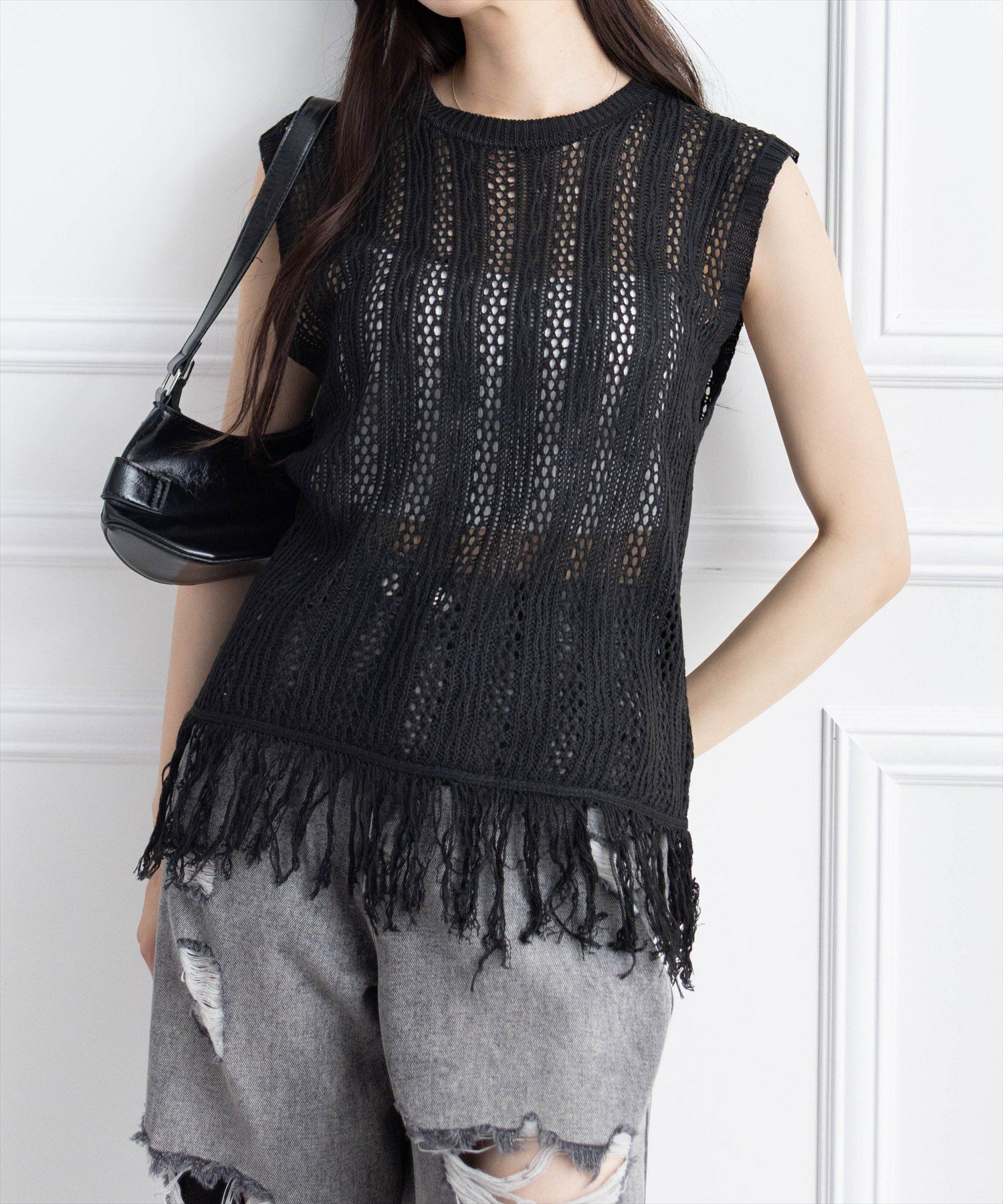 透け感と揺れ感で魅せる、大人の抜け感トップス!メッシュフリンジニットトップス【デザイン】ざっくりとした編み地にフリンジをあしらった、透け感が魅力のメッシュニットトップス♪ヒップまで隠れる長めの丈と裾の揺れるディティールがスタイリングに抜け感をプラス!【コーディネート】キャミやタンクとのレイヤードでヘルシーな肌見せが楽しめ、着こなし次第でカジュアルにもストリートにも着用していただけます◎