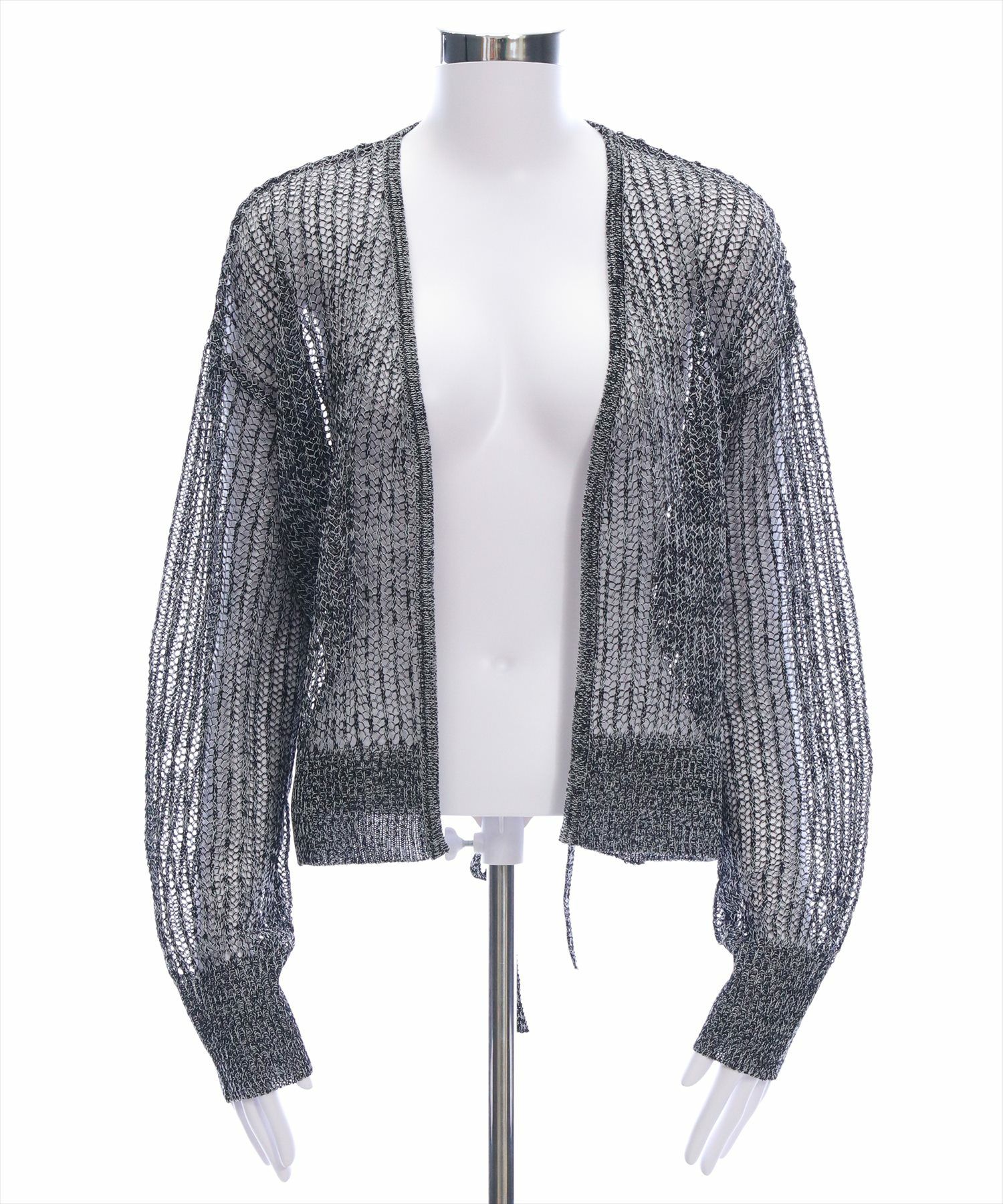 ヘルシーな肌見せが叶う!ウエストリボンメッシュ長袖カーディガン【デザイン】サイドのリボンを後ろで結んで羽織として、前で結んでトップス風に!着回しができるカーディガン。程よくゆったりとしたシルエットでどんなアイテムに重ねてもごわつかないのもポイント♪コーディネートに合わせやすいブラックと夏らしい涼し気なブルーの2色展開です。【コーディネート】カジュアルスタイルにはもちろん、シンプルなコーディネートに合わせるだけで今季らしい雰囲気に◎